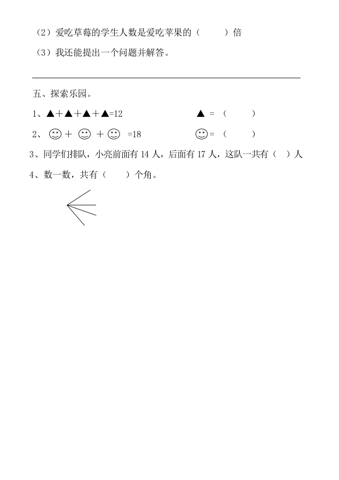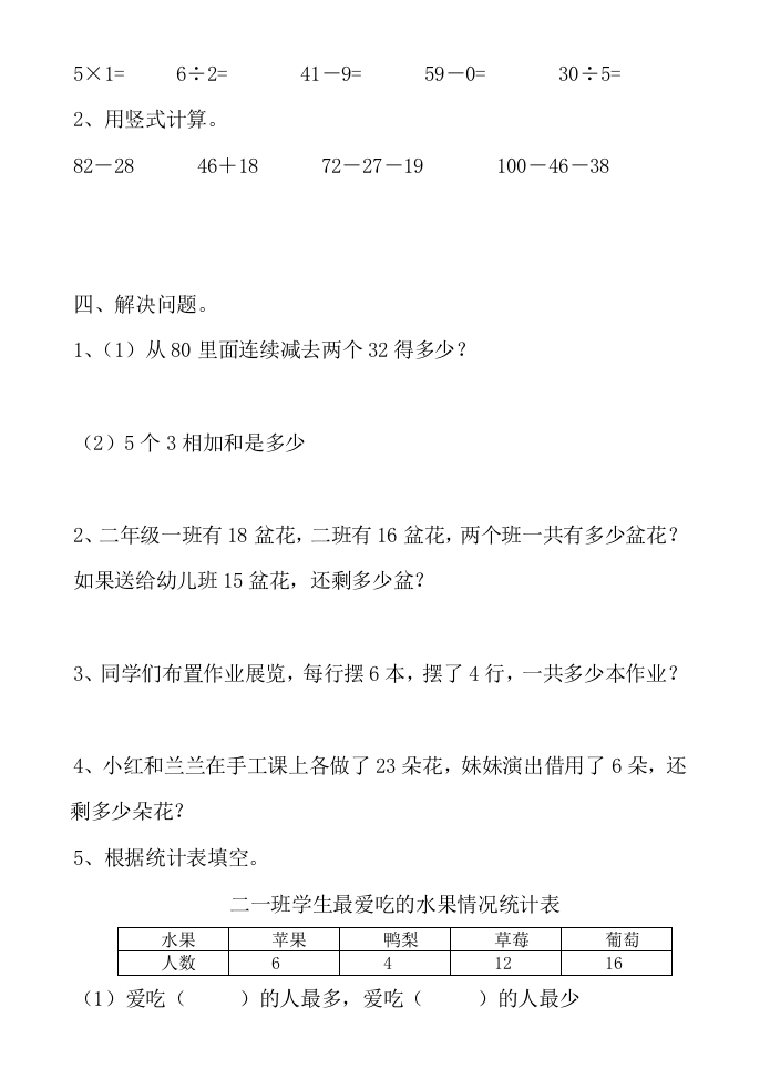 二年级数学上册期末练习题班级:姓名:一、填空1、写出各部分名称4936367×6=422、根据口诀“四五二十”,我能写出的算式有:3、()里最大能填几。()×5<323×()<1626>6×()()×7<115×()<3163>8×()4、在○里填上合适的符号。1×1○1+118÷6○12÷412○2-63小时○30分25○25=503×5○25-77×8○606+8○6×85、100,98,96,二、请画一个锐角,并标出顶点和边。三、用心算一算。1、口算,直接写出得数。4×3=0×6=4+3=69+21=90+10=