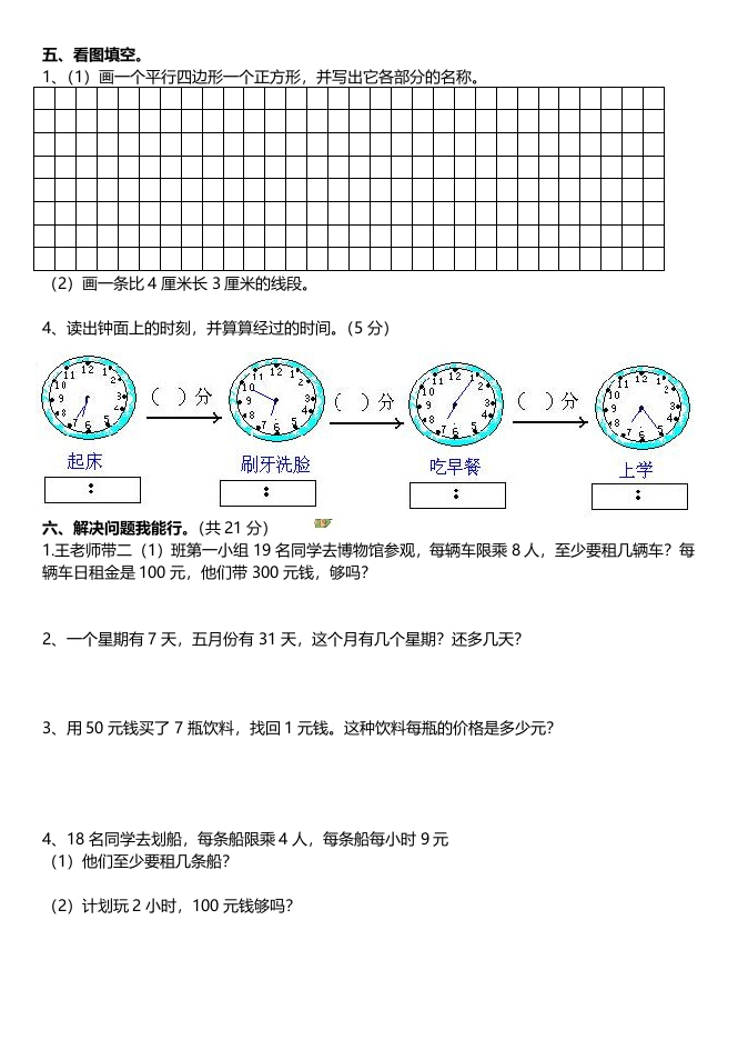 一、我会填。1、70dm=(m5dm=()cm2千克=()克1分30秒=()秒1小时20分=()分14分o14秒1时o90分90厘米o9分米1米o105厘米4×()<15()×5<313×()<282、小红排队时在第56位,每9人一队比赛,小红在第()队。3、聪聪绕操场跑一圈用58秒,亮亮用了1分零四秒,()跑的快,快()秒。4、钟面上有()个大格,()个小格。分针走()圈是2小时。5、角是由()个顶点和()条边组成的。6、4、0、口各代表多少?0+0+0=15△+口=28△+0=12△=()o=()口=(7、在括号里填上合适的单位。电视机的高度是6(),粉笔约长7(丫丫做5道算术题用4(),小朋友要每天睡10(二、对号入座。燃。1、一张床长()。A20分米B.20米C20厘米2、☐=3.。最大时,被除数和余数分别是(A.27.6B.25.6C.23.63、学生用的三角板上有()个直角。A.2B.1C.34、盒子里装着10个红球和1个白球,从中任意摸出一个球,()是白球。A一定B.可能C.不可能5、钟面上时钟走一大格,分针走(A1小格B.5小格C.60小格三、火眼金睛辨对错。(对的在括号里画V,错的画X)@1、一支铅笔的长度是12分米。2、哥哥长得很高,比爸爸高10米。3、在乘法算式5×7=35中,35是这个算式的商。4、吃一顿饭大约用15秒。5、计算三位数加、减三位数,一般都从十位算起。6、1千克铁比一干克棉花重。7、余数一定要比除数小。(四、我是计算小能手。1、78÷9=43÷8=36÷5=517+242=756-312=319+450=2、列竖式计算。带*验算(8分)135+217+129*700-55+218*672(229+117)