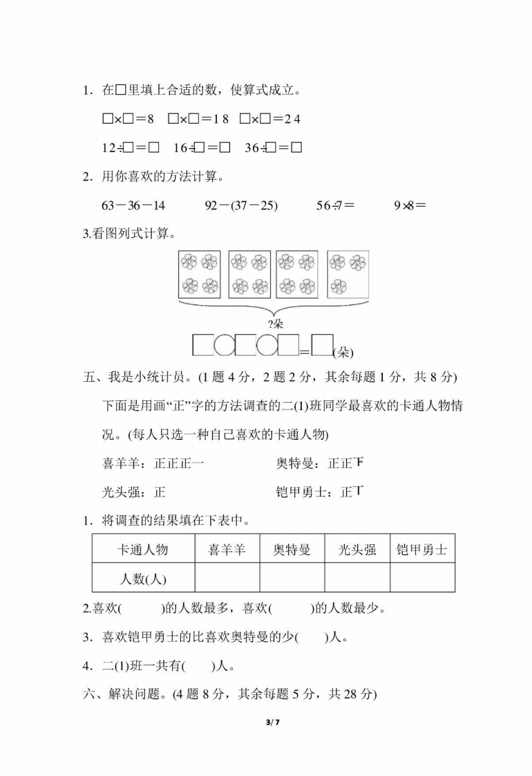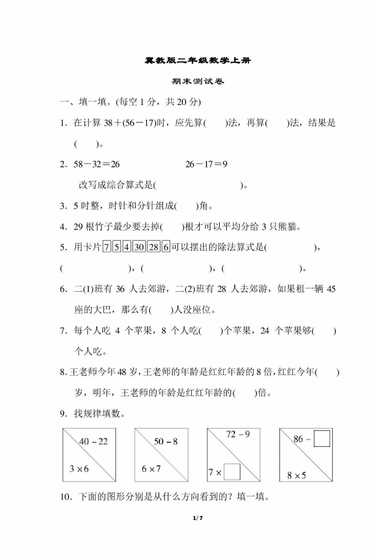 冀教版二年级数学上册期末测试卷一、填一填。(每空1分,共20分)1.在计算38+(56一17)时,应先算()法,再算()法,结果是()。2.58-32=2626-17=9改写成综合算式是(3.5时整,时针和分针组成()角4.29根竹子最少要去掉()根才可以平均分给3只熊猫。5.用卡片75430286可以摆出的除法算式是()(),(),(6.二(1)班有36人去郊游,二(2)班有28人去郊游,如果租一辆45座的大巴,那么有()人没座位。7.每个人吃4个苹果,8个人吃()个苹果,24个苹果够()个人吃。8.王老师今年48岁,王老师的年龄是红红年龄的8倍,红红今年()岁,明年,王老师的年龄是红红年龄的()倍。9.找规律填数。72-940-2250-886-3×66×77×8×510.下面的图形分别是从什么方向看到的?填一填。1/7