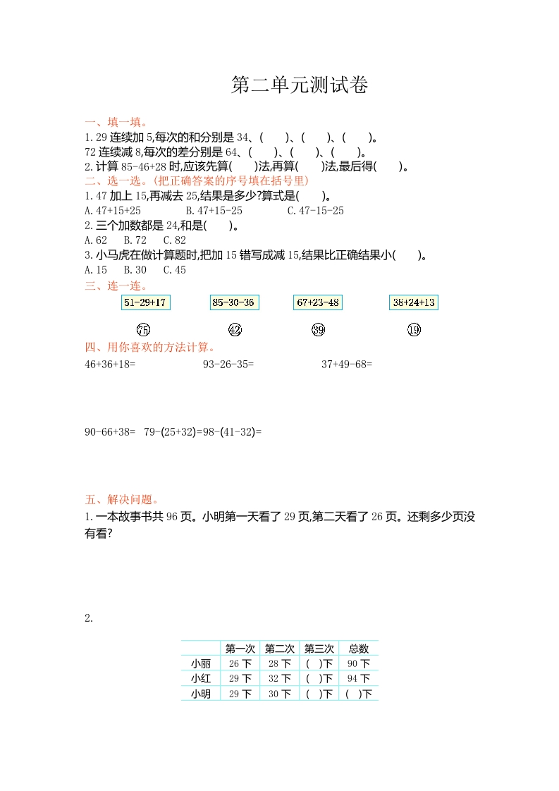 第二单元测试卷一、填一填。1.29连续加5,每次的和分别是34、()入、(入()。72连续减8,每次的差分别是64、()、(入、()。2.计算85-46+28时,应该先算()法再算()法最后得()。二、选一选。(把正确答案的序号填在括号里)】1.47加上15,再减去25,结果是多少?算式是()。A.47+15+25B.47+15-25C.47-15-252.三个加数都是24,和是()。A.62B.72C.823.小马虎在做计算题时把加15错写成减15,结果比正确结果小()。A.15B.30C.45三、连一连。51-29+1785-30-3667+23-4838+24+13团②39⑨四、用你喜欢的方法计算。46+36+18=93-26-35=37+49-68=90-66+38=79-(25+32)=98-(41-32)=五、解决问题。1.一本故事书共96页。小明第一天看了29页,第二天看了26页。还剩多少页没有看?2.第一次第二次第三次总数小丽26下28下()下90下小红29下32下()下94下小明29下30下()下()下