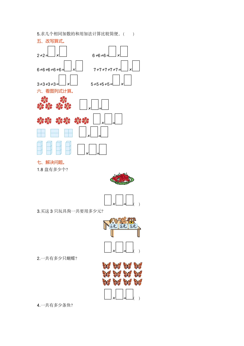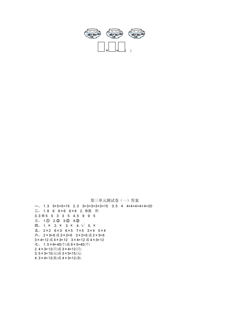 第三单元测试卷(一)一、数一数说一说写算式。1.带缘装黎紫,装袋装装产()个5加法算式是2.5个()加法算式是3.)个(,加法算式是二、填一填。1在加法算式88+8+88+8中,相同的加数是(,相同的加数的个数是(,写成乘法算式是()或(2.在算式3×4=12中.3和4是()12是(3.3×5读作,表示()个(相加或()个()相加.4.用乘法算式表示5个9相加是()×()或()().三、选一选。(把正确答案的序号填在括号里)1.2×302+3.0里应填().①>②<③=2.3个6相加的和是多少?错误的算式是(①3×6②3+6③6+6+63.与4×5结果不相同的算式是(①4×4+4②4+5③5×554.3+1+4+1+3.可写成算式(①3X5②4×5③4×3四、判断题。(对的画“√”错的画“×”)1加法算式都可以改写成乘法算式.()2.3+2可以写成3×2.()3.5×3表示5个3相乘.()4.10+10+10+10=10×4=4×10()