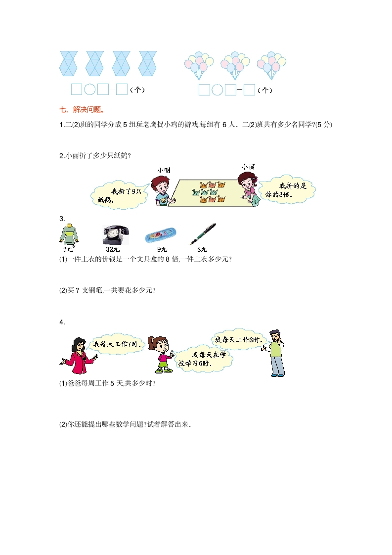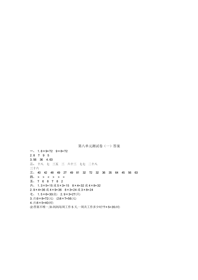 第八单元测试卷(一)一、填一填。1根据口决“八九七十二”,可以写出的两道乘法算式分别是()、()2.8+8+8+8+8+8+8=9×4+9=3.8的7倍是(H)是9的4倍4.一个乘数是7另一个乘数是9积是().二、把口诀补充完整。二九()三()二十一()十五()六十八七九())四十九四七()六六()三、算一算。8×5=7×6=6×8=6×7+7=9×3=7×7=9×9=8×3+8=8×9=4×8=4×9=7×6-7=8×8=9×5=7×8=8×9-9=四、在○厘填上“>”“<”或”=”36+42○8×97×7○4818-9○3×42x9○4×47×8○6×937-2○5×7五、在()里填上合适的数。5×()=35()×9=546×()=48()×9=635×()=40()×9=6×3六、看图列式计算。系弟桑?个?个■○■-■个)☐O☐-☐个,2