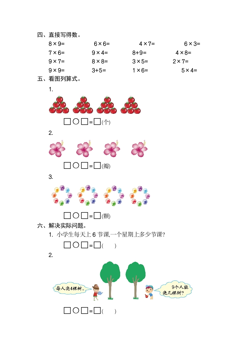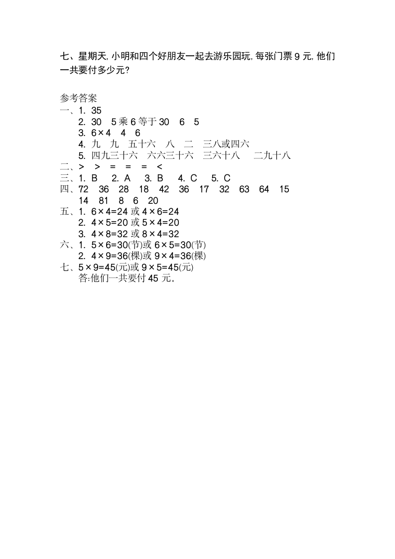 第八单元测试卷(二)一、我会填。1.一个乘数是5,另一个乘数是7,积是(2.5×6=(),读作(),表示(个()相加.3.6+6+6+6用乘法算式表示是(),它表示()个()相加。4.把口诀补充完整。七()六十三五()四十五七八()四()三十二)六十二()二十四5.分别写出两句得数相同的乘法口决3618)(二、在○里填上“>”“<”或“=”。6×6○6×25×5○5+57+7+7○7×32×2○2+24×8○8×48×9-9○8×8三、我会选。(把正确答案的序号填在括号里)1.下面()表示3个5相加.A.3+3+3+3+3B.3×5C.6+42.求右图中有几支笔,正确的算式是()。A.4+4+4+4+4+4B.6+6+6+6C.6+43.下面的算式中,积是14的是().A.7+7B.2×7C.8×24.一根木头锯成5段,每锯一次要用4分,一共用()分.A.9B.20C.165.()个4连续相加,得数是24.A.2B.4C.6