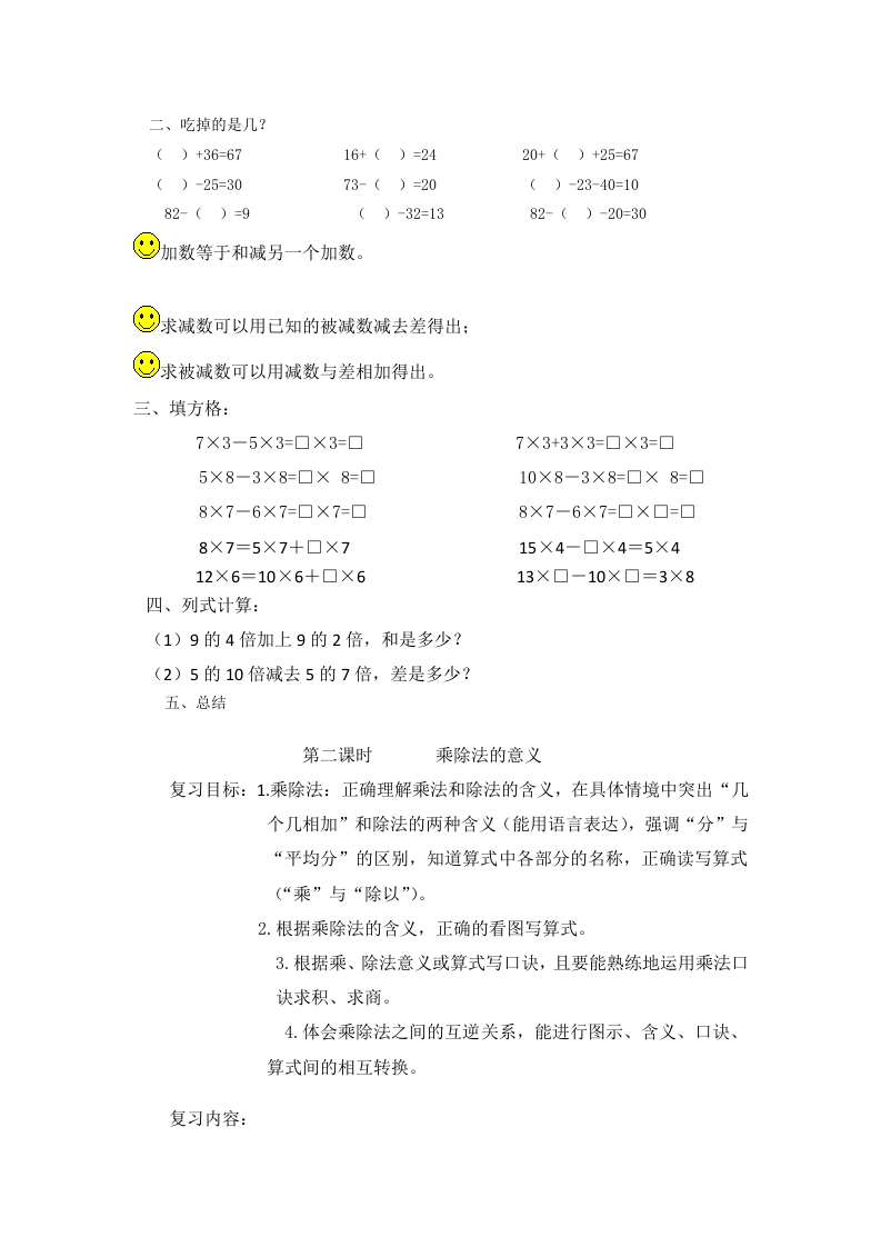 二年级第一学期数学期终复习计划一、复习内容1、计算:100以内加减法的巧算、方框里填几、几个几加减几个几的巧算的方法。2、概念:乘除法的意义3、图形:角的认识、角的分类、长方体、正方体、长方形、正方形的认识。4、应用题:一步的应用题。二、课时安排:四课时:计算一课时:100以内加减法的巧算、方框里填几、几个几加减几个几的巧算的方法。概念一课时:乘除法的意义图形一课时:角的认识、角的分类、长方体、正方体、长方形、正方形的认识。应用一课时:一步的应用题。第一课时计算复习目标:1、能利用“被减数和减数同时加上或减去同样的数,差不变”和“一个加数增加而另一个加数同时减少同样的数,和不变”,将一些两位数加减两位数的问题转化成两位数加减整十数的问题进行计算2、运用加法中加数与和的关系来求出算式中的加数,运用减法中被减数、减数与差的关系来求出算式中的被减数或减数3、几个几加减几个几的巧算的方法。复习内容:一、巧算19+27=20+32+2765+28+30=39+1664-47-5076-3841-2530=72-27⑨把一个加数变成计算更容易。把变成整十数,计算更容易。