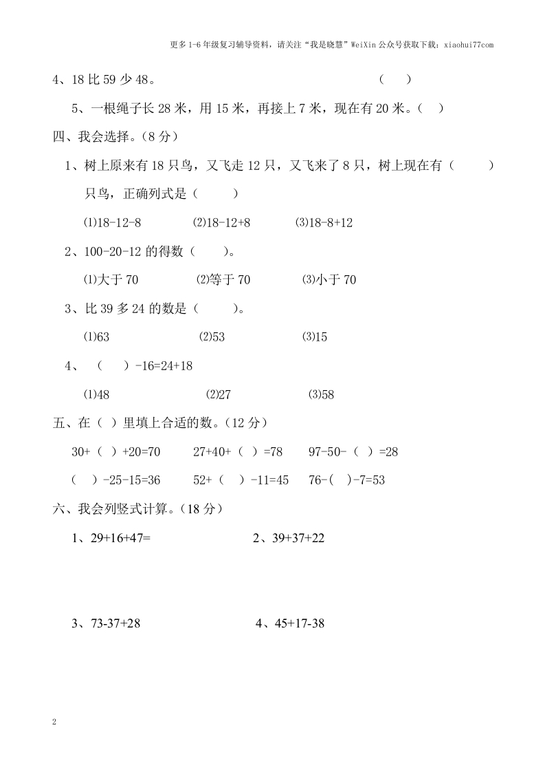 更多16年级复习辅导资料,请关注“我是晓慧”WeiXin公众号获取下载:xiaohui77co通苏教版二年级上册第1单元100以内的加法与减法(三)一、我会很快算出得数。(共9分)40+39=71-16=35+35=30+20=78-30=68-4=60+15-60=88+2-40=24+6+28二、我会填空。(共24分)1、最大两位数与最小三位数相差是()。2、87-32+45,先算(),再算(3、计算连加、连减时的运算顺序是()。4、35与28的和再减去17,列式是(5、78比19多(),37比75少(6、小白兔拔了38个大萝卜,小灰兔和小黑兔各要走了12个,小白兔还有()个大萝卜。7、妈妈买了20个苹果,小红先吃了4个,还剩(),又吃了9个,还剩()个。8、兰兰有8张邮票,明明有12张邮票,兰兰比明明少()张,明明再给兰兰()张,两人就同样多。三、公正的小法官。(10分)1、加减混合运算的运算顺序是先算加法,再算减法。()2、48-17-11的得数大于20.3、比29多14的数是43。()1