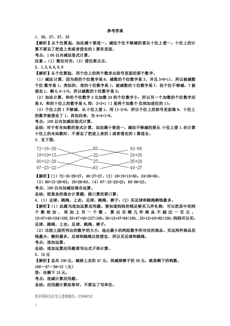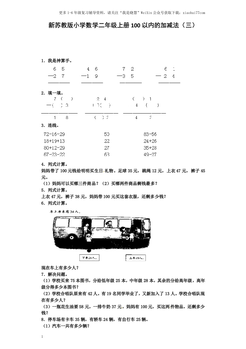 更多1-6年级复习辅导资料,请关注“我是晓慧”WeiXin公众号获取下载:xiaohui77com新苏教版小学数学二年级上册100以内的加减法(三)1.我是神算手。6546726-27-19-35一212.填一填。7()24-1)3118()3.连线。72-16-295083-5618+19+132224+2680+12-292735+2867-2.3-22.6349-274.列式计算。妈妈带了100元钱给明明买生日.礼物。足球35元,跳绳12元,上衣47元,裤子45元。(1)妈妈可以买哪三件商品?(2)买哪两件商品剩钱最多?5.列式计算。上衣47元,裤子38元,妈妈带100元买这套衣服,还剩多少钱?6.列式计算。车上承来有34人下21人上年9人现在车上有多少人?7.解决问题。(1)学校买来75本图书,分给低年级25本,中年级28本,其余的分给高年级,高年级分得多少本图书?(2)学校合唱队原来有42人。有19名同学毕业了,又新加入了13人。学校合唱队现在有多少人?(3)一瓶花生油要58元,一排牛奶37元,妈妈有100元,买这两件物品,还剩多少钱?8.停车场有卡车35辆,有轿车24辆,有自行车25辆。(1)汽车一共有多少辆?