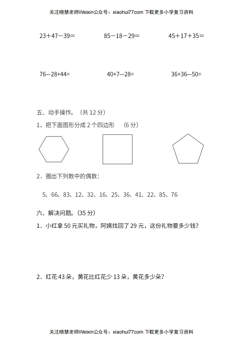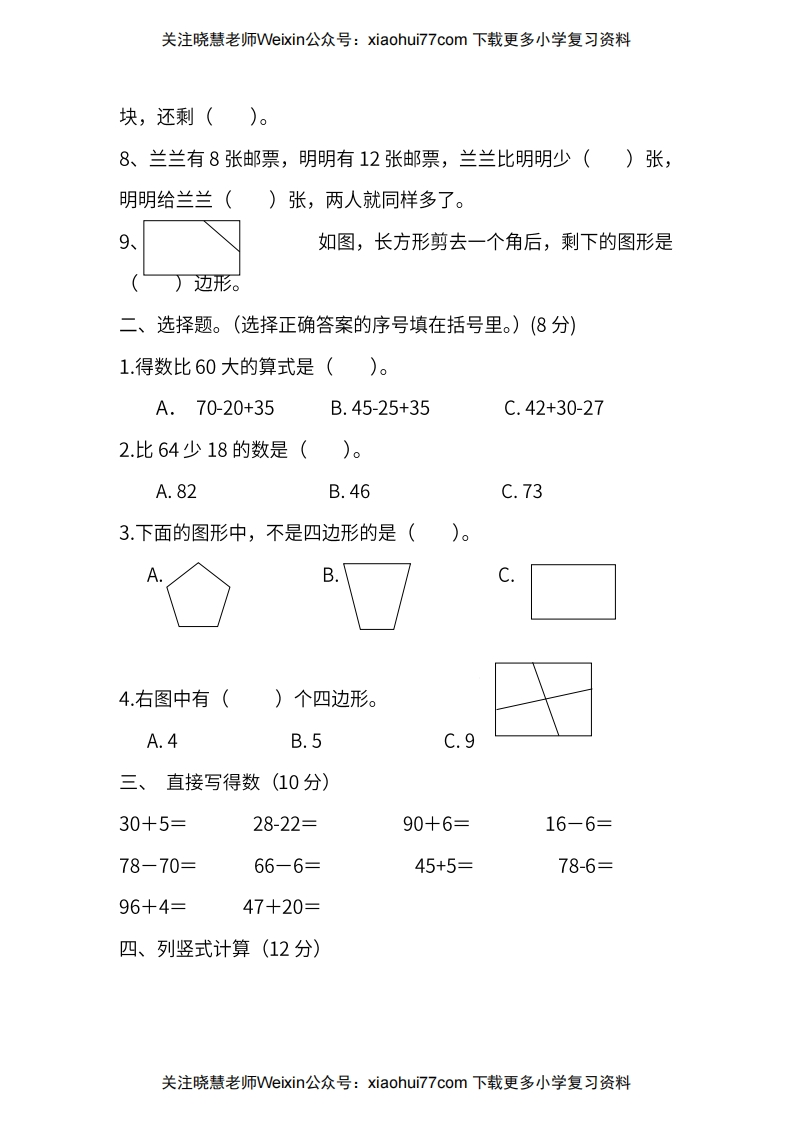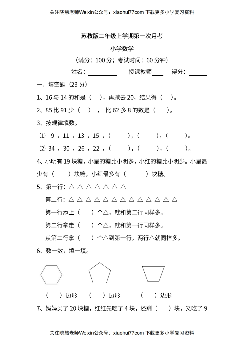 关注晓慧老师Veixin公众号:xiaohui77com下载更多小学复习资料苏教版二年级上学期第一次月考小学数学(满分:100分;考试时间:60分钟)姓名:授课教师得分:一、填空题(23分)1、16与14的和是(),再减去20,结果得()。2、85比91少(),比62多8的数是()。3、按规律填数。(1)9,11,13,15,(),(),()。(2)34,30,26,22,(),()。4、小明有19块糖,小星的糖比小明多,小红的糖比小明少。小星最少有()块糖,小红最多有()块糖。5、第-行:△△△△△△△第二行:△△△△△△△△△△△△△第一行添上()个△,就和第二行同样多。第二行拿走()个△,就和第一行同样多。从第二行拿()个△到第一行,两行△就同样多。6、数一数,填一填。()边形()边形()边形7、妈妈买了20块糖,红红先吃了4块,还剩()块,又吃了9关注晓慧老师Veixin公众号:xiaohui77com下载更多小学复习资料