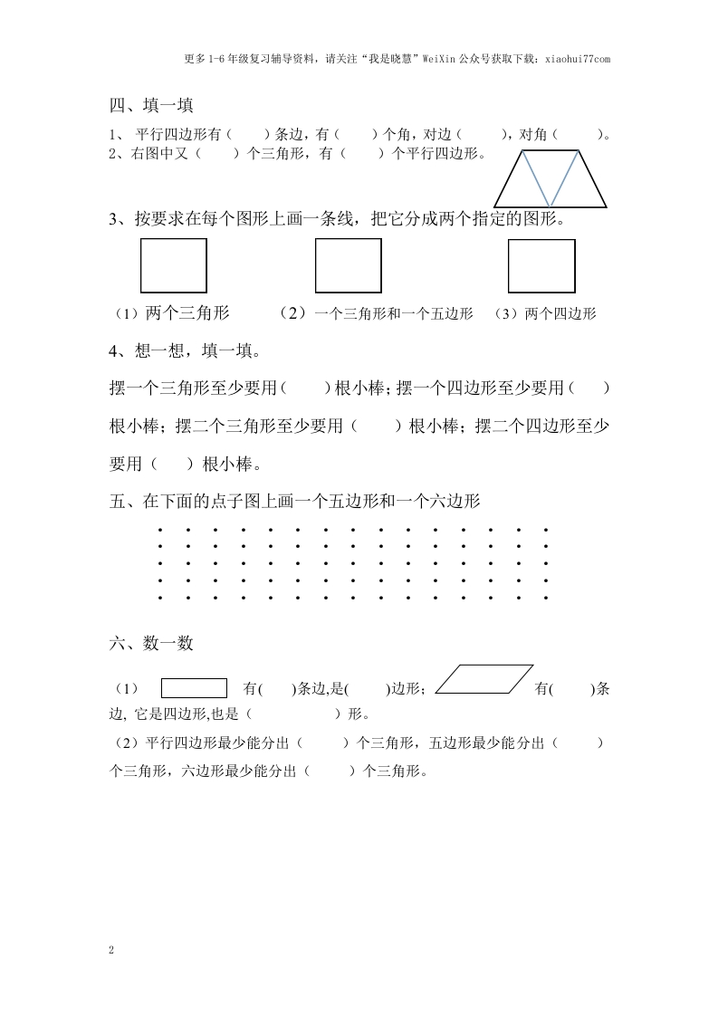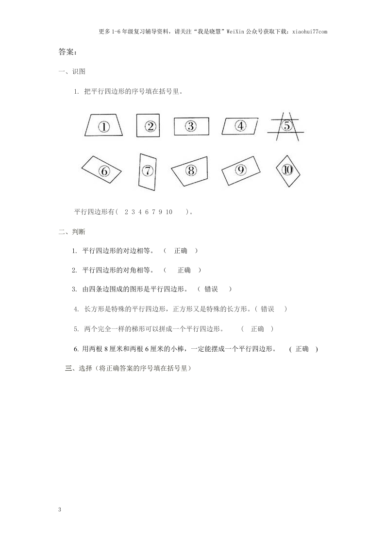 更多1-6年级复习辅导资料,请关注“我是晓慧”WeiXin公众号获取下载:xiaohui77com苏教版数学二年级上学期第2单元测试卷一、识图1.把平行四边形的序号填在括号里。②③④⑧⑨10平行四边形有(二、判断1.平行四边形的对边相等。()2.平行四边形的对角相等。()3。由四条边围成的图形是平行四边形。()4.长方形是特殊的平行四边形,正方形又是特殊的长方形。()5.两个完全一样的梯形可以拼成一个平行四边形。()6.用两根8厘米和两根6厘米的小棒,一定能摆成一个平行四边形。()三、选择(将正确答案的序号填在括号里)1.下面的四边形中,()不是平行四边形。①②③2.平行四边形的()相等。①四条边②对边