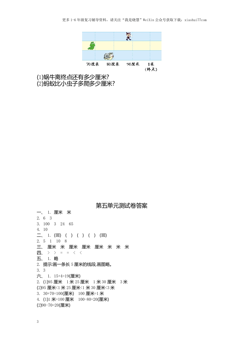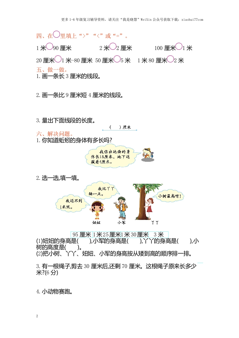 更多1-6年级复习辅导资料,请关注“我是晓慧”WeiXin公众号获取下载:xiaohui77com第五单元测试卷一、填一填。1.测量铅笔的长度用()作单位比较合适测量床的长度用()作单位比较合适。2.0米123÷567910油画棒长()厘米。3.1米=()厘米300厘米()米30厘米6厘米()厘米45厘米+20厘米=()厘米4.甜甜身高90厘米,再长()厘米她的身高是1米。二、辨一辨。1.下图中哪些图形是线段?在下面画“”。(5分)2.下面的图形中各有几条线段?(8分))条)条()条)条三、在括号里填上合适的长度单位。亮亮与高120().教室长10()。杯子高10()。黄瓜长20(谋来高80(跳纸大约长3()。床长2(楼高30().1