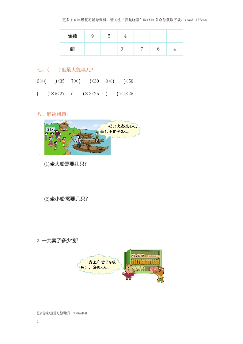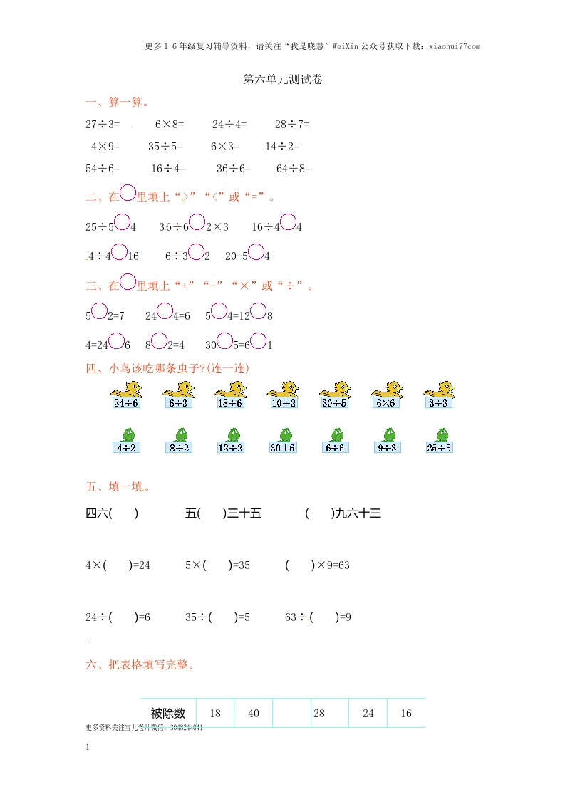 更多16年级复习辅导资料,请关注“我是晓慧”WeiXin公众号获取下载:xiaohui77com第六单元测试卷一、算一算。27÷3=6×8=24÷4=28÷7=4×9=35÷5=6×3=14÷2=54÷6=16÷4=36÷6=64÷8=二、在○里填上“>”“<”或“=”25÷5○436÷6○2×316÷4○44÷4○166÷3○220-5○4三、在○里填上“+”“_”“X”或“÷”。5○2=724○4=65○4=12○为424○68○2-430○5-6○四、小鸟该吃哪条虫子?(连一连】18÷610÷230÷56×61÷28÷212÷230166÷69÷325÷5五、填一填。四六()五()三十五()九六十三4×()=245×()=35()×9=6324÷()=635÷()=563÷()=9六、把表格填写完整。被除数1840282416更多资料关注雪儿老师微信:304824404H
