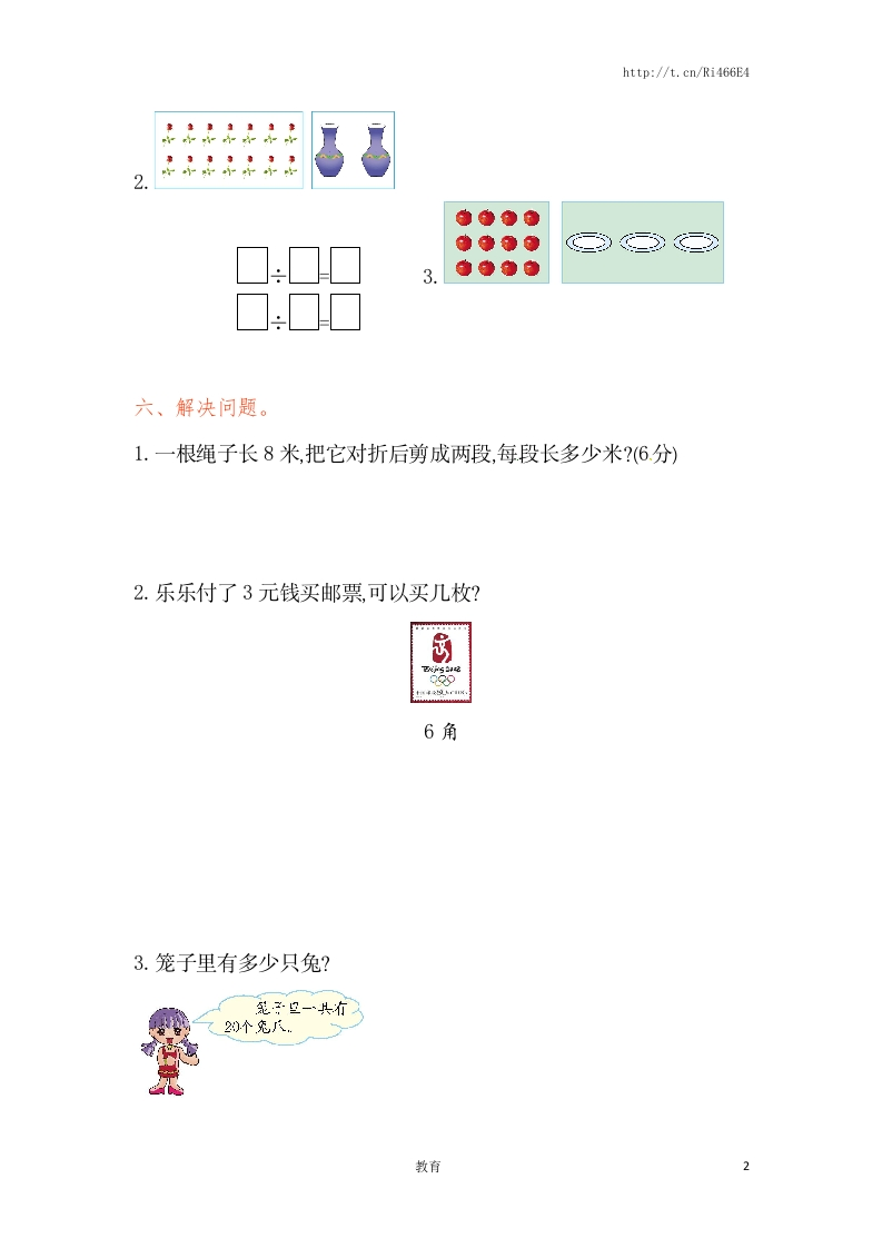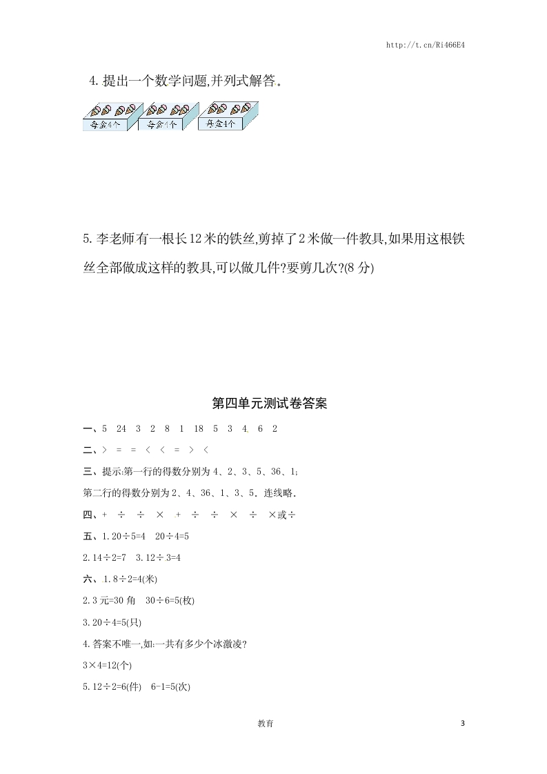 http://t.cn/Ri466E4第四单元测试卷一、直接写出得数。15÷3=6×4=12÷4=6÷3=4×2=5÷56×3=10÷218÷616÷4=36÷6=8÷4=二、在里填上“>”“<”或“=”25÷5○436÷62X316÷4○425÷5○64÷4○166÷3○220-5○424÷66三、小猫该吃哪条鱼?连一连。TT21÷66÷3518÷6610÷26×63[3÷384÷212:330+66÷69÷325÷5四、在里填上.“+”“X”或“÷”52=-7124-355-15○3=12○36=24○48○4-245-20306-5○1五、看图写算式。20条教育