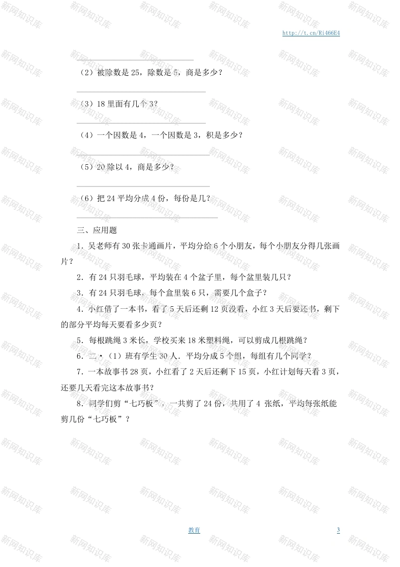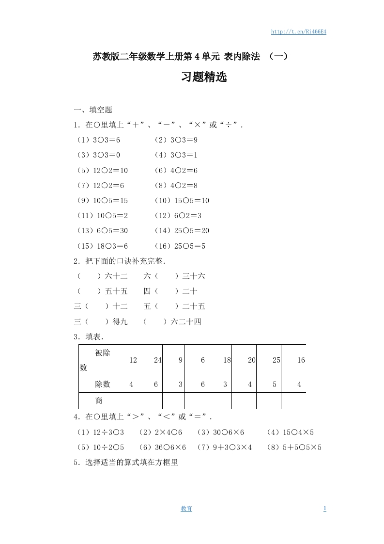 http://t.cn/Ri466E4苏教版二年级数学上册第4单元表内除法(一)习题精选一、填空题1.在O里填上“十”、“一”、“X”或“÷”.(1)3O3=6(2)3○3=9(3)3○3=0(4)3O3=1(5)12○2=10(6)4○2=6(7)12O2=6(8)4○2=8(9)10○5=15(10)15○5=10(11)10○5=2(12)6○2=3(13)6○5=30(14)2505=20(15)18○3=6(16)2505=52.把下面的口诀补充完整,()六十二六()三十六()五十五四()二十三()十二五()二十五三()得九()六二十四3.填表.被除12249618202516数除数46363454商4.在○里填上“>”、“<”或“=”(1)12÷3○3(2)2×4○6(3)30○6×6(4)15O4×5(5)10÷2○5(6)36○6×6(7)9+3○3×4(8)5+5O5×55.选择适当的算式填在方框里教直