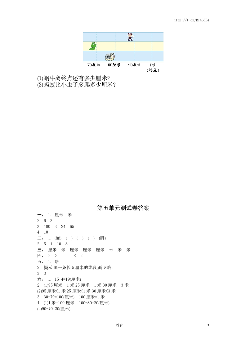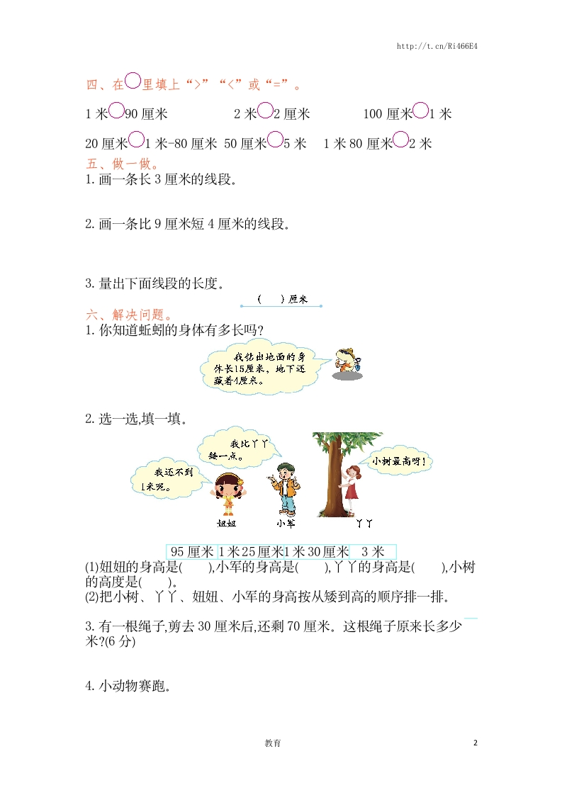 http://t.cn/Ri466E4第五单元测试卷一、填一填1.测量铅笔的长度用()作单位比较合适;测量床的长度用()作单位比较合适。2.包一二米L23÷5676910油画棒长()厘米。3.1米=()厘米300厘米=()米30厘米-6厘米=()厘米45厘米+20厘米=()厘米4.甜甜身高90厘米,再长()厘米,她的身高是1米。二、辨一辨1.下图中哪些图形是线段?在下面画“厮”。(5分)2.下面的图形中各有几条线段?(8分)()条)条)条)条三、在括号里填上合适的长度单位。亮竞与高120().教室长10(杯子高10()。黄瓜长20(谍桌高80(。跳纸大约长3()。床长2()。楼高30()教育