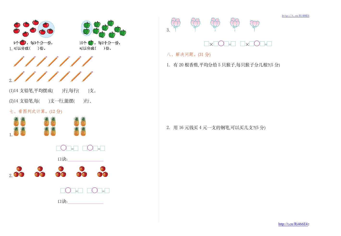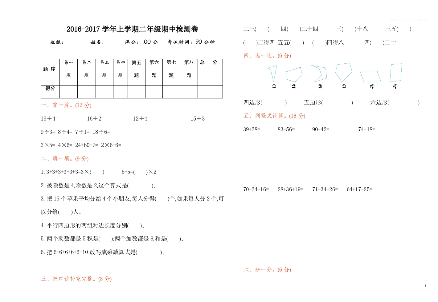 2016-2017学年上学期二年级期中检测卷二三()四()二十四三()十八三五()班级:姓名:满分:100分考试时间:90分钟()二得四五五()()四得八四()二十四、选一选。(6分)第一第二第三第四第五第六第七第八总分题序题题题题题题题题得分一、算一算。(12分)四边形(五边形(六边形(16÷416÷2=12÷4=15÷3=五、列竖式计算。(16分)9÷3=8÷47÷1=18÷6=39+28=83-56=90-42=74-18=3×5=4×6=24+60-7=2×6-6=二、填一填。(9分)1.3+3+3+3+3+3=3×()5+5=()×22.被除数是4,除数是2,这个算式是()70-24-16=28+36+19=71-34+26=64+17-253.把16个苹果平均分给4个小朋友,每人分得()个,如果每人分2个,可以分给()人4.平行四边形的两组对边长度分别().5.两个乘数都是5,积是(两个加数都是8,和是()。6.把6+6+6+6+6-10改写成乘减算式是()。六、分一分。(6分)三、把口诀补充完整。(8分)