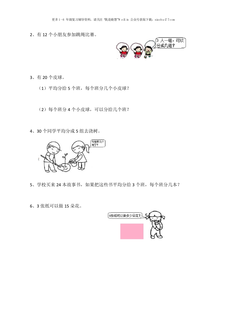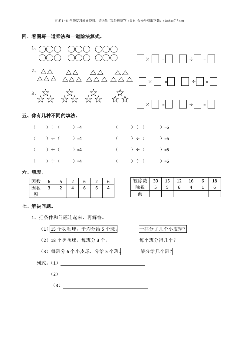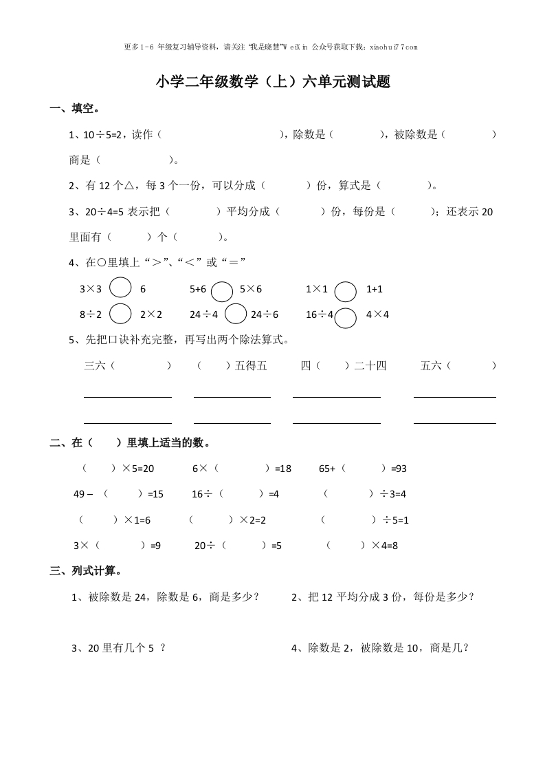 更多1-6年级复习轴导资料,请关注我是晓慧WeXn公众号获取下载:xohu77com小学二年级数学(上)六单元测试题一、填空。1、10÷5=2,读作(),除数是(),被除数是(商是()2、有12个△,每3个一份,可以分成()份,算式是()。3、20÷4=5表示把()平均分成()份,每份是():还表示20里面有()个()。4、在O里填上“>”、“<”或“=”3X365+65X61×11+18÷22X224÷424÷616÷44×45、先把口诀补充完整,再写出两个除法算式。三六(()五得五四()二十四五六(二、在()里填上适当的数。()×5=206×()=1865+()=9349-()=1516÷()=4r)÷3=4r)×1=6)X2=2()÷5=13×()=920÷()=5()×4=8三、列式计算。1、被除数是24,除数是6,商是多少?2、把12平均分成3份,每份是多少?3、20里有几个5?4、除数是2,被除数是10,商是几?