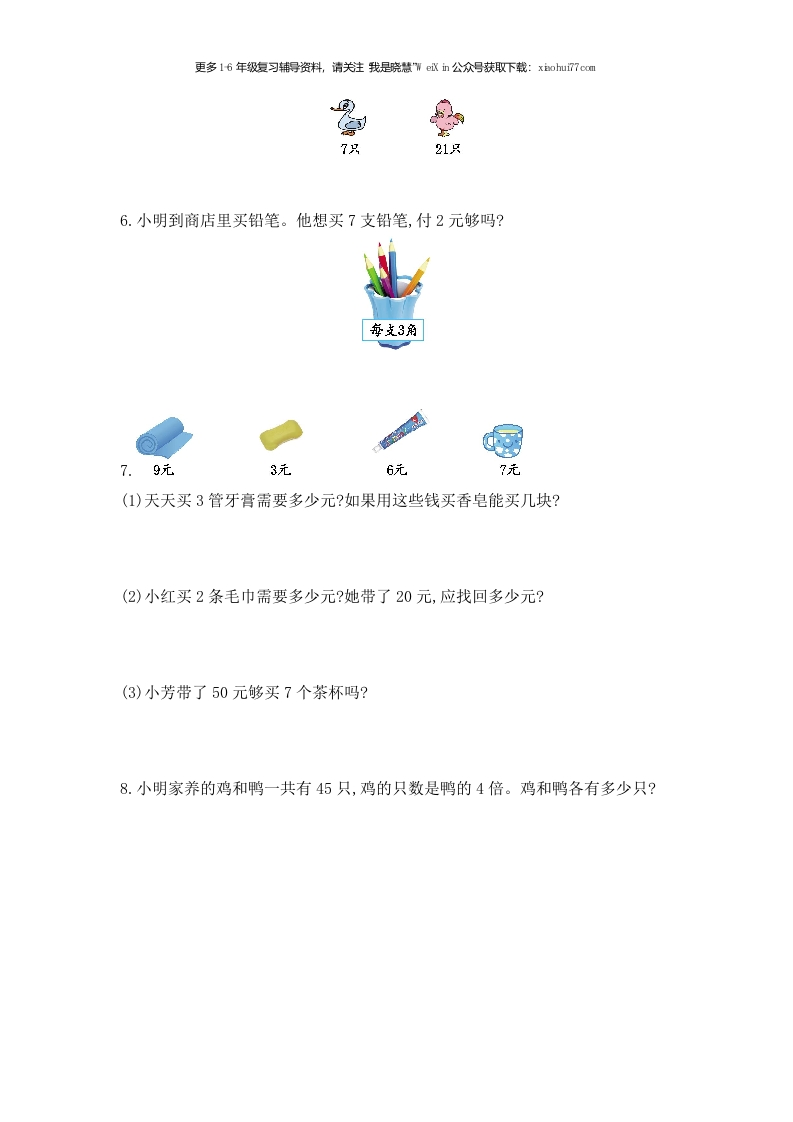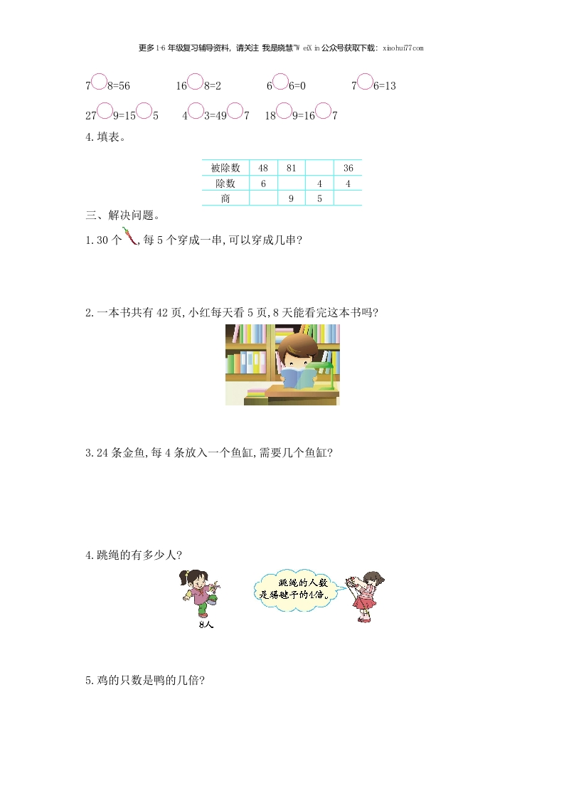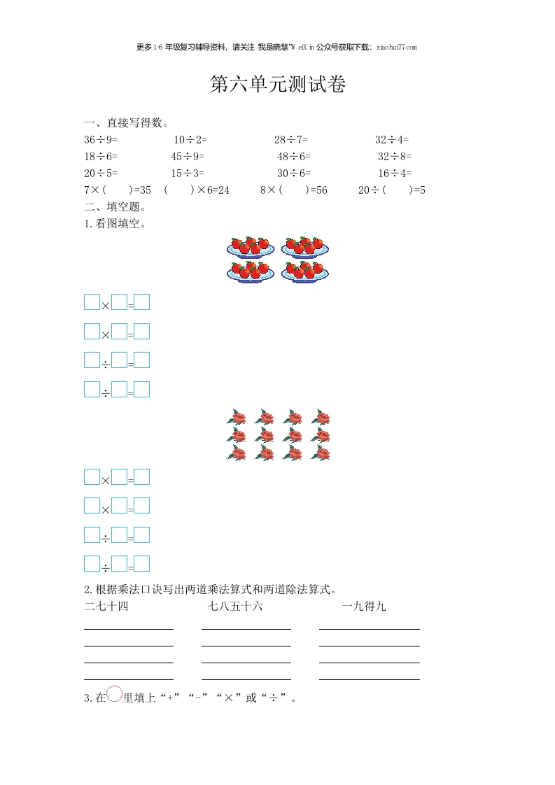 更多16年级复习辅导资料,请关注我是晓慧”WeXn公众号获取下载:xaohui77com第六单元测试卷一、直接写得数。36÷9=10÷2=28÷7=32÷4=18÷6=45÷9=48÷6=32÷8=20÷515÷3=30÷6=16÷4=7×()=35()×6=248×()=5620÷()=5二、填空题。1.看图填空。□:□□金金□×□■□×□■2.根据乘法口诀写出两道乘法算式和两道除法算式。二七十四七八五十六一九得九3.在○里填上“+”“”“X”或“÷”