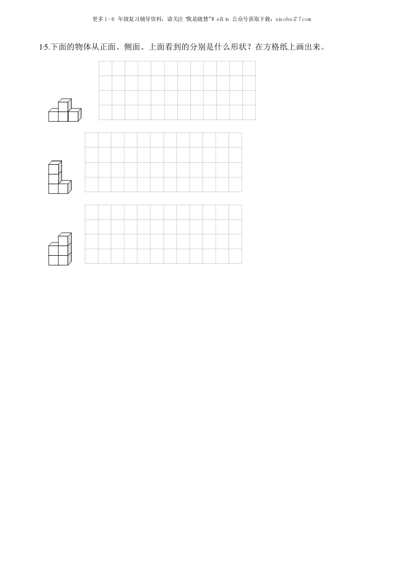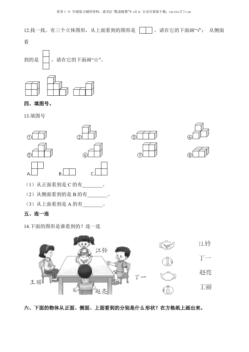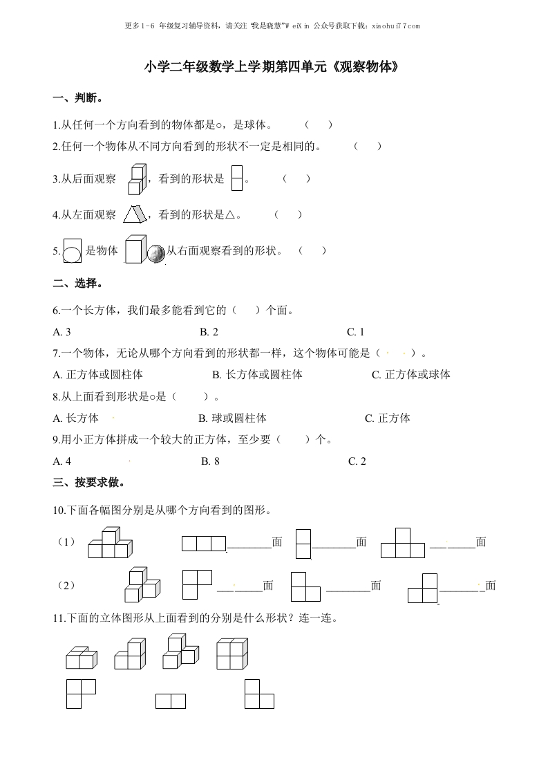 更多1-6年级复习辅导资料,请关注我是晓慧”WeXn公众号获取下载:xohu77com小学二年级数学上学期第四单元《观察物体》一、判断。1.从任何一个方向看到的物体都是o,是球体。2.任何一个物体从不同方向看到的形状不一定是相同的。()3.从后面观察看到的形状是4.从左面观察看到的形状是△。是物体从右面观察看到的形状。()二、选择。6.一个长方体,我们最多能看到它的()个面。A.3B.2C.17.一个物体,无论从哪个方向看到的形状都一样,这个物体可能是(··)。A.正方体或圆柱体B.长方体或圆柱体C.正方体或球体8.从上面看到形状是o是()A.长方体B.球或圆柱体C.正方体9.用小正方体拼成一个较大的正方体,至少要()个。A.4B.8C.2三、按要求做。10.下面各幅图分别是从哪个方向看到的图形。(1)面面(2)面面11.下面的立体图形从上面看到的分别是什么形状?连一连。