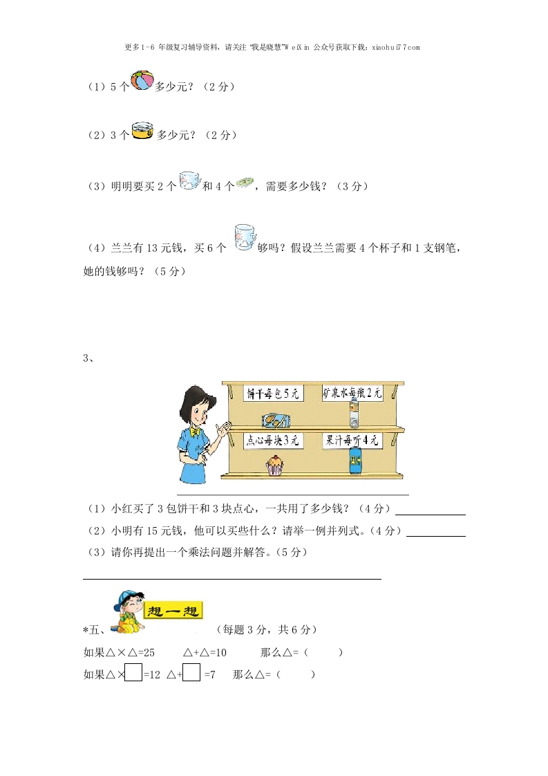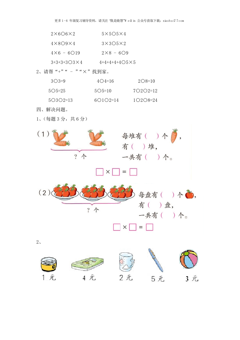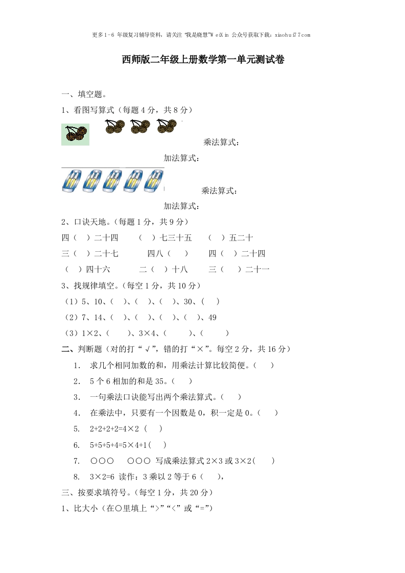 更多1-6年级复习辅导资料,请关注我是晓慧WeXn公众号获取下载:xohu77com西师版二年级上册数学第一单元测试卷一、填空题。1、看图写算式(每题4分,共8分)露乘法算式:加法算式:乘法算式:加法算式:2、口诀天地。(每题1分,共9分)四()二十四()七三十五()五二十三()二十七四八()四()二十四()四十六二()十八三()二十一3、找规律填空。(每空1分,共10分)(1)5、10、()、()、()、30、()(2)7、14、()、()、()、()、49(3)1×2、()、3×4、()、(二、判断题(对的打“√”,错的打“×”。每空2分,共16分)1.求几个相同加数的和,用乘法计算比较简便。()2.5个6相加的和是35。()3.一句乘法口决能写出两个乘法算式。()4.在乘法中,只要有一个因数是0,积一定是0。()5.2+2+2+2=4×2()6.5+5+5+4=5×4+1()7.oooooO写成乘法算式2×3或3×2()8.3×2=6读作:3乘以2等于6(),三、按要求填符号。(每空1分,共20分)1、比大小(在O里填上“>”“<”或“=”)
