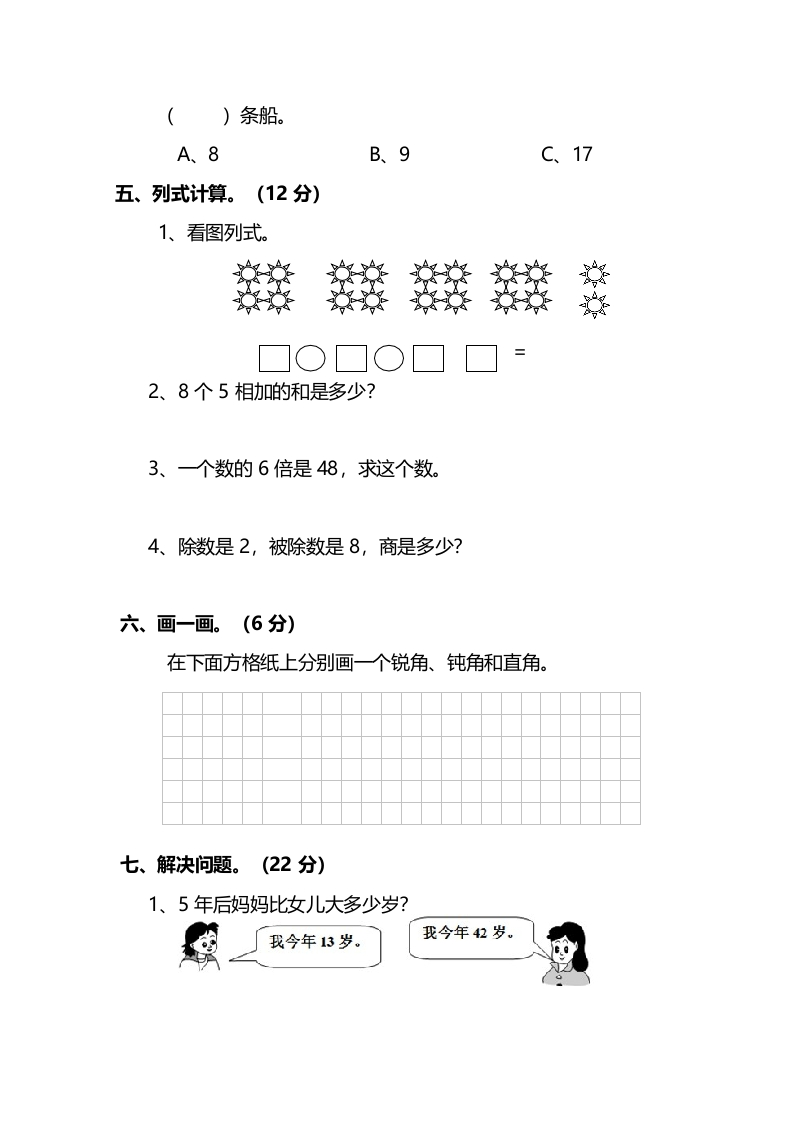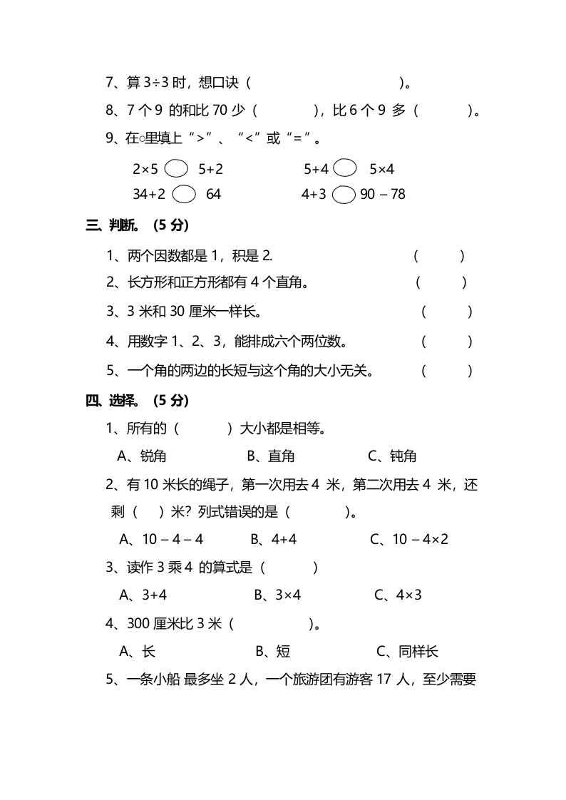 西师大版二年级(上)数学期末测试卷时间:60分钟满分:100分题号三四五六七总分得分直接写出得数。(20分)8×9=6×7=5×4=9×7-7=5×6=4×9=7×8=6×9+9=32-8=40+28=56+9=67-40+21=3÷3=8÷1=27÷9=24÷3=3×9+3=3×8-14=5×8-20=4×8+3=二、填一填。(30分)::1、3个6相勖加,写成溗法算式是(),读作()乘(两个因数分别是()和(),积是()。2、4米=()厘米1米-60厘米=()厘米。3、小芳走一步的距离是48(),小东的身高是123(:教室大约长10(4、8个9相加,和是();7的4倍是(製45比()少8:60比55多()5、()里最大能填几?()×5<22)×4<2960>9×(()×4<266×()<3268>9×(6、一个角有()个顶点,()条边。