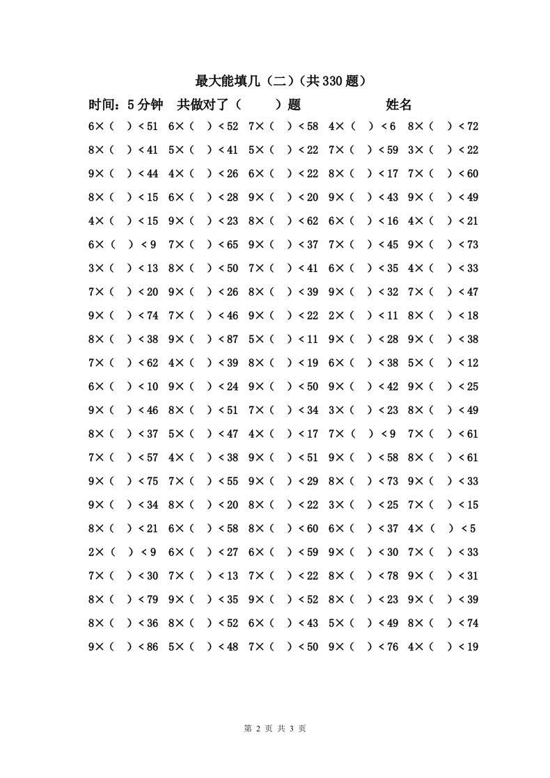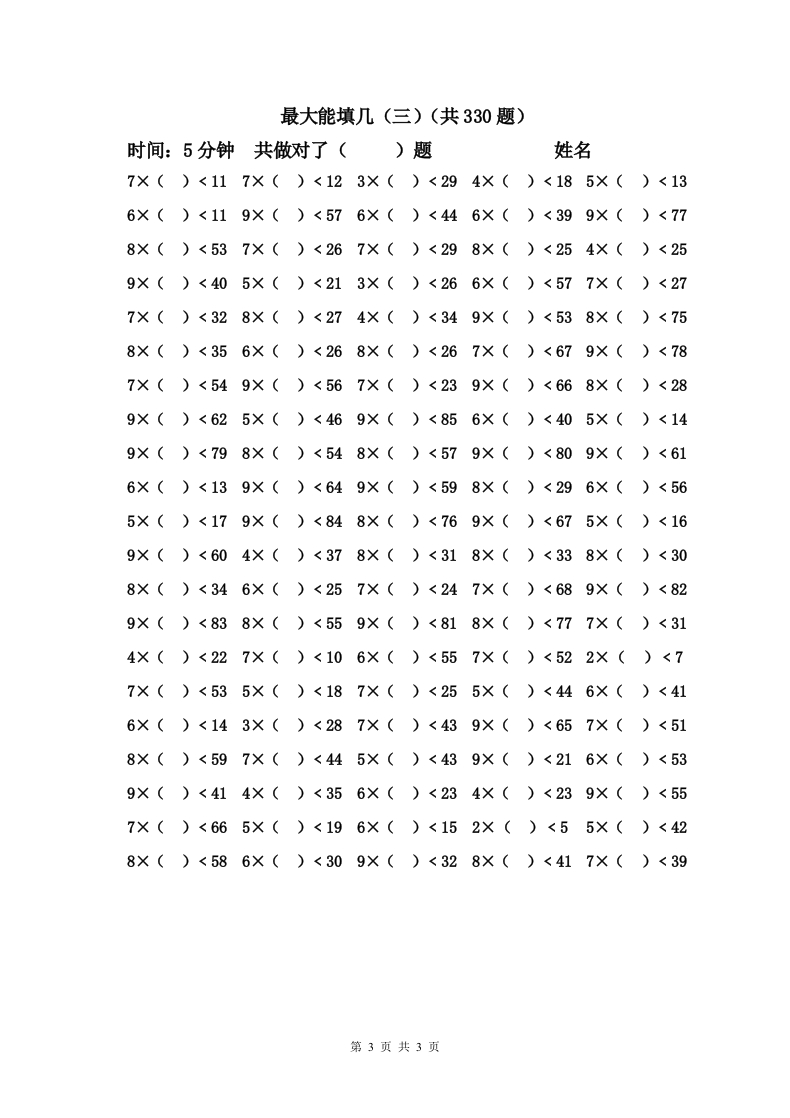 最大能填几(一)(共330题)时间:5分钟共做对了()题姓名9×()<108×()<457×()<184×()<137×()<388×()<443×()<176×()<328×()<116×()<506×()<75×()<67×()<393×()<43×()<192×()<196×()<469×()<112×()<178×()<687×()<88×()<95×()<75×()<336×()<212×()<36×()<312×()<158×()<695×()<287×()<485×()<295×()<365×()<399×()<173×()<207×()<178×()<104×()<315×()<264×()<298×()<466×()<475×()<378×()<705×()<389×()<134×()<306×()<495×()<316×()<194×()<96×()<204×()<103×()<148×()<433×()<106×()<334×()<276×()<179×()<698×()<129×()<155×()<277×()<376×()<299×()<125×()<89×()<688×()<133×()<168×()<673×()<53×()<115×()<249×()<169×()<145×()<236×()<454×()<114×()<123×()<78×()<635×()<349×()<716×()<87×()<168×()<667×()<365×()<322×()<138×()<477×()<699×()<707×()<193×()<89×()<477×()<408×()<144×()<148×()<427X()<648×()<659×()<488×()<714×()<79×()<196×()<345×()<99×()<72第1页共3页