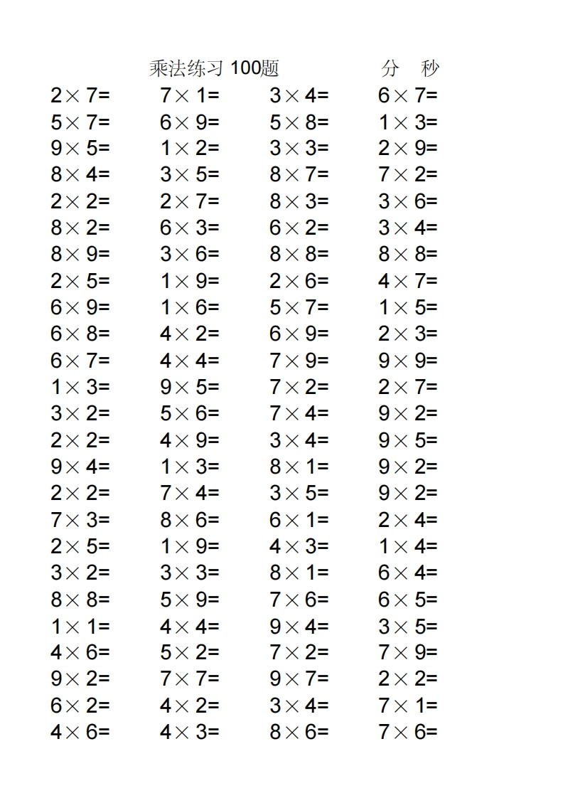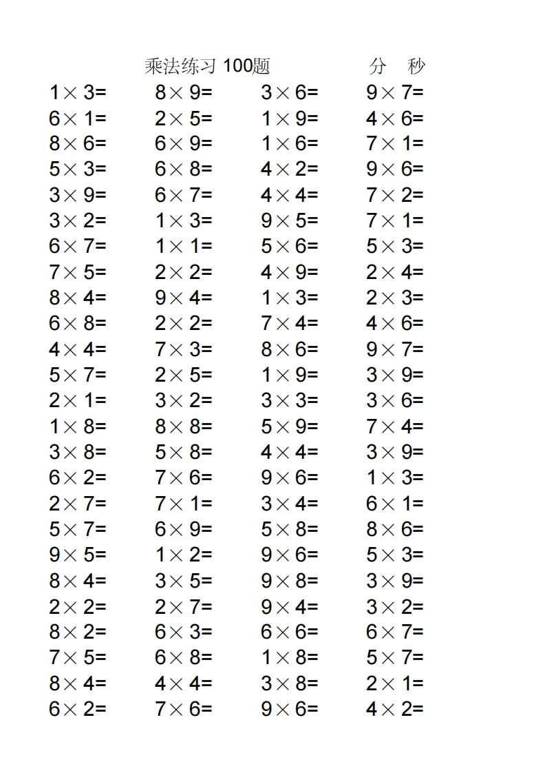 乘法练习100题分秒7×3=9×4=4×9=1×4=3×2=6×8=4×1=4×3=8×4=4×1=2×5=8×8=1×5=5×9=1×8=4×6=5×1=4×1=9×7=3×8=9×7=8×5=6×5=1×3=5×9=3×1=9X7=9×6=3×2=4×9=6×8=9×8=3×9=7×2=7×2=9×4=7×3=3×7=9×1=6×6=7×4=5×8=3×2=9×7=8×9=8×6=9×1=4×6=9×2=5×1=6×8=7×1=3×3=1×5=3×5=9×6=8×1=9×1=9×8=7×2=4×2=4×6=8×3=7×1=3×4=9×9=2×8=5×3=5×1=2×1=3×5=2×4=6×8=5×3=1×8=2×3=1×4=5×4=5×9=4×6=8×4=6×6=4×7=9×7=7×2=2×9=6×8=3×9=1×2=4×5=9×8=3×6=3×1=7×9=8×9=7×4=4×4=1×3=8×2=3×9=