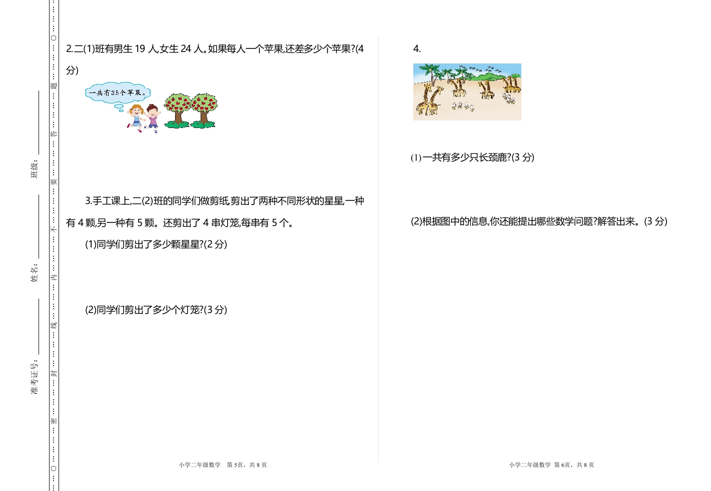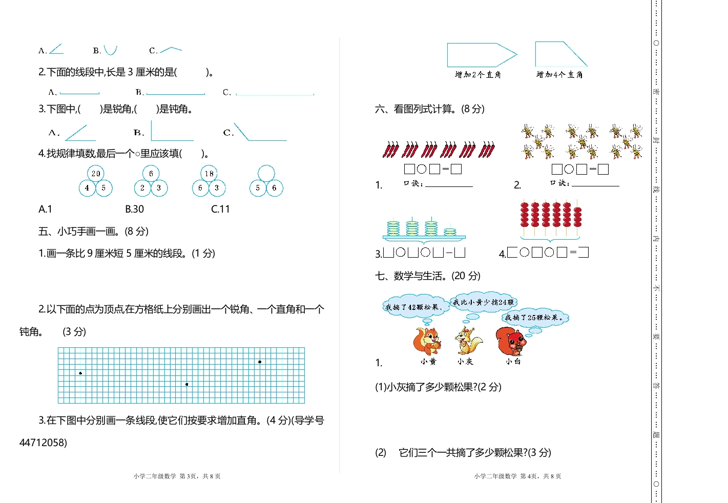 ::二年级上学期期中检测卷(一)()得四五五()四得八班级:姓名:满分:100分:考试时间:90分钟5.两个乘数都是6,积是()两个加数都是5,和是()。题序第一第二第三第四第五第六第七总分6.把6+6+6-4改写成乘减算式是()。题题题题题题题7.在括号里填厘米或米。得分我能算得对又快。(16分)火柴棒长4(大树高9(身高136(2×5=6×3=4×3=2×3+19=8左图中,有条线段,有()个直角。80-3=7+55=6×2=3×3+2=9.在括号里填上合适的数。长4×6=5×5=4×5=6×6-7=::37+()=534×()=2465-()=386×5=3×5=87-25=4×2+45=战()×5=1080-()=63()×()=12二、想一想填一填。(29分)三、用竖式计算。(14分):1.28+37=52-48=83-38=12+29+45=21::铅笔长()厘米橡皮长()厘米:93-56-27=54-38+27=46+(32-18)=2.比56多9的数是(),比82少47的数是()。3.5+5+5+5=()×()7+7=()×()4.把口诀补充完整。四、我来选一选。(填序号)(5分)二三(四()二十四三(十八1.下面的图形中,不是角的是()。小学二年级数学第1页,共8页小学二年级数学第2页,共8页: