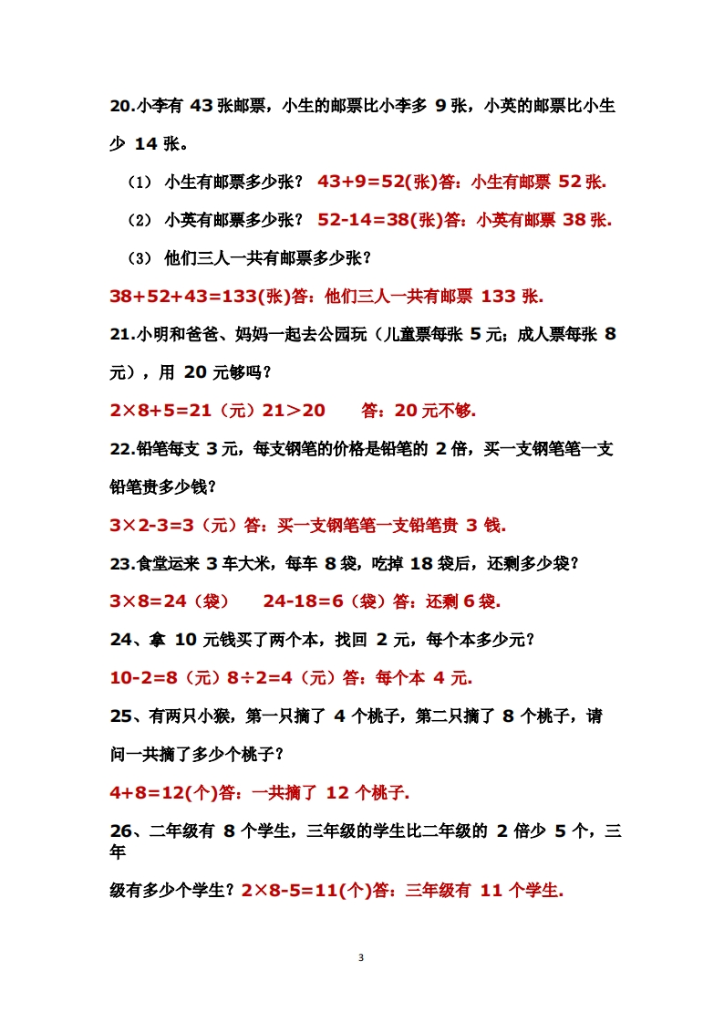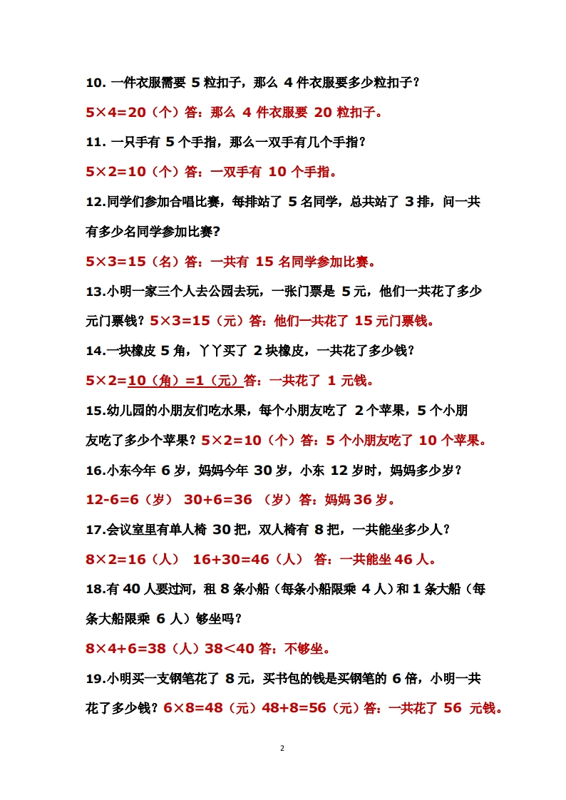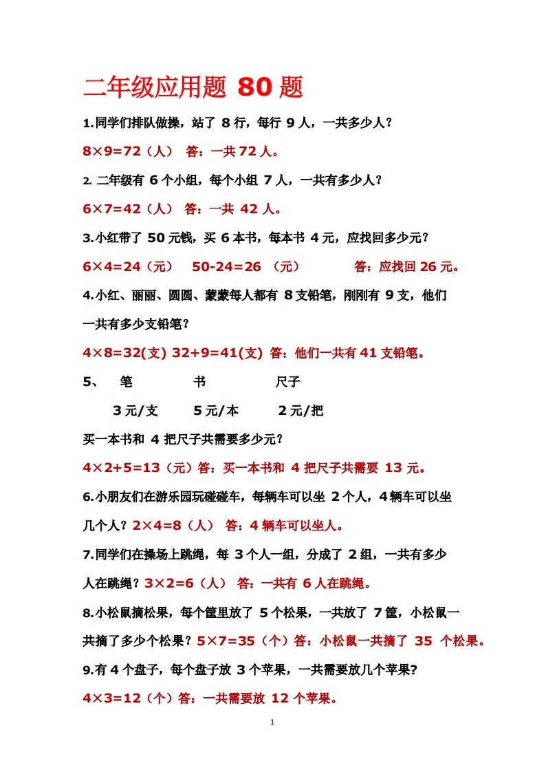二年级应用题80题1.同学们排队做操,站了8行,每行9人,一共多少人?8×9=72(人)答:一共72人。2.二年级有6个小组,每个小组7人,一共有多少人?6×7=42(人)答:一共42人。3.小红带了50元钱,买6本书,每本书4元,应找回多少元?6×4=24(元)50-24=26(元)答:应找回26元。4.小红、丽丽、圆圆、蒙蒙每人都有8支铅笔,刚刚有9支,他们一共有多少支铅笔?4×8=32(支)32+9=41(支)答:他们一共有41支铅笔。5、笔书尺子3元/支5元/本2元/把买一本书和4把尺子共需要多少元?4×2+5=13(元)答:买一本书和4把尺子共需要13元。6.小朋友们在游乐园玩碰碰车,每辆车可以坐2个人,4辆车可以坐几个人?2×4=8(人)答:4辆车可以坐人。7.同学们在操场上跳绳,每3个人一组,分成了2组,一共有多少人在跳绳?3×2=6(人)答:一共有6人在跳绳。8.小松鼠摘松果,每个筐里放了5个松果,一共放了7筐,小松鼠一共摘了多少个松果?5×7=35(个)答:小松鼠一共摘了35个松果。9.有4个盘子,每个盘子放3个苹果,一共需要放几个苹果?4×3=12(个)答:一共需要放12个苹果。