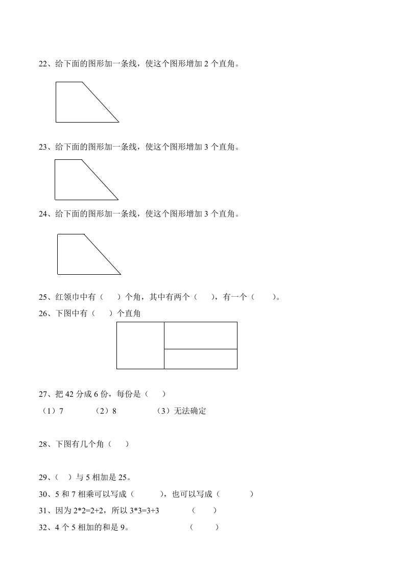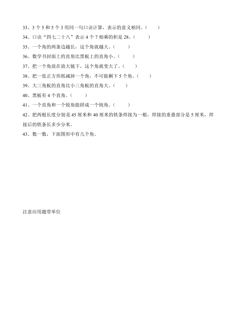 二年级上期数学错题整理1、在横线上画O☆是○的5倍,有()个。2、()与4相加是20,()个4相加是20。3、4和6相乘可以写成(),也可以写成()。4、2个5和5个2用同一句口诀计算,表示的意义相同。()5、口诀“四五二十”表示4个5相乘的积是20。()6、锐角都比钝角小。()7、钝角都比锐角大。()8、比钝角小的都是直角。()9、比锐角大的都是钝角。()10、直角都比锐角大。()11、每一句乘法口诀都能写出两道乘法算式。()12、4+4+4+4+4+3可以改写成算式()或(13、小明家住在5楼,每上一层楼需1分钟,小明从一楼走到五楼需要几分钟?14、小亮想钉板凳,板凳面厚6里面。现有下面三种长度的钉子,小亮应该选()长的钉子比较合适。(1)6厘米(2)5厘米(3)7厘米15、小红家离学校很远,大约有100()远。16、教师的门高3米。()17、2个6相乘的积加上18得多少?列式是()(1)6*2+18(2)6*6+18(3)6+6+1818、加法算式:6+6+6+6=24,乘法算式:(19、用两个下面的直角三角形,拼成一个较大的三角形,这个较大的三角形还有直角吗?()20、量一双鞋子的长度,一般用分米作单位。()21、有()个角,()个直角