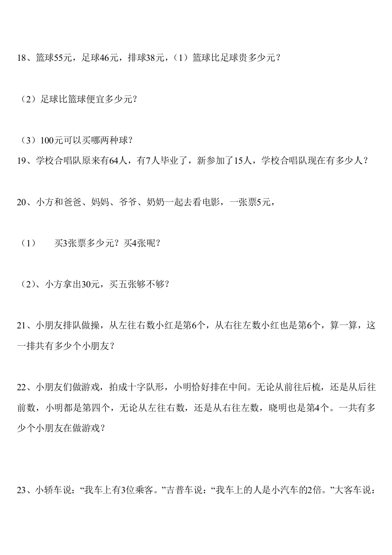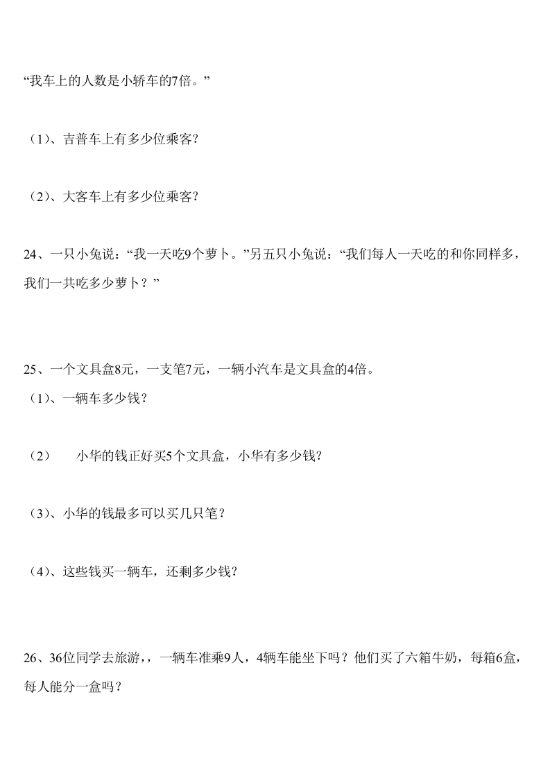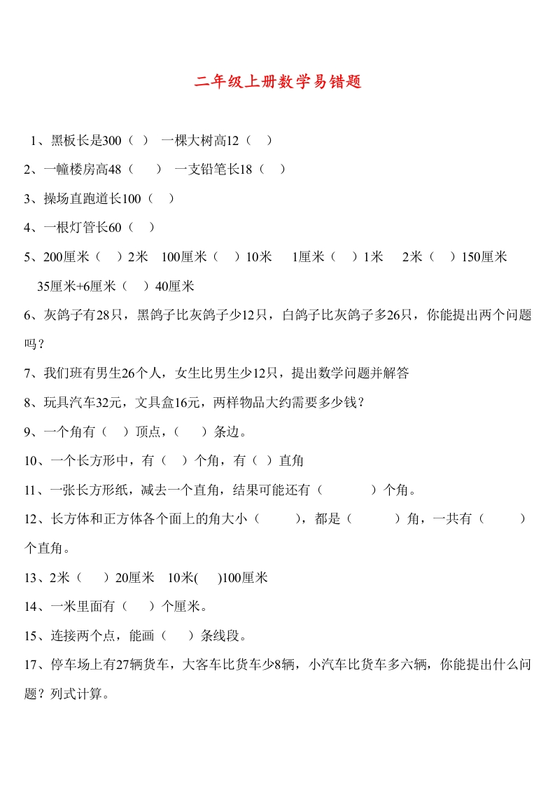 二年级上册数学易错题1、黑板长是300()一棵大树高12()2、一幢楼房高48()一支铅笔长18()3、操场直跑道长100()4、一根灯管长60()5、200厘米()2米100厘米()10米1厘米()1米2米()150厘米35厘米+6厘米()40厘米6、灰鸽子有28只,黑鸽子比灰鸽子少12只,白鸽子比灰鸽子多26只,你能提出两个问题吗?7、我们班有男生26个人,女生比男生少12只,提出数学问题并解答8、玩具汽车32元,文具盒16元,两样物品大约需要多少钱?9、一个角有()顶点,()条边。10、一个长方形中,有()个角,有()直角11、一张长方形纸,减去一个直角,结果可能还有()个角。12、长方体和正方体各个面上的角大小(),都是()角,一共有()个直角。13、2米()20厘米10米()100厘米14、一米里面有()个厘米。15、连接两个点,能画()条线段。17、停车场上有27辆货车,大客车比货车少8辆,小汽车比货车多六辆,你能提出什么问题?列式计算。