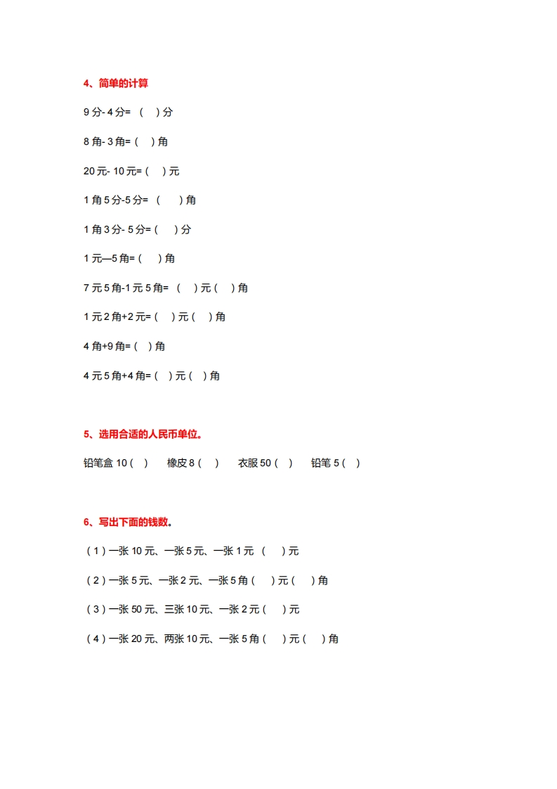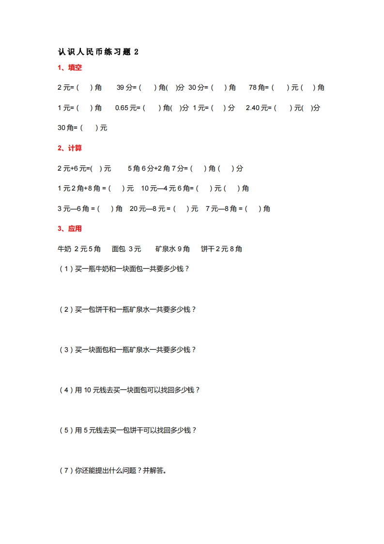 认识人民币练习题11、填空。(1)人民币的单位有()、()、()。(2)一张2角可以换()张1角。(3)一张5角可以换()张1角,还可以换()张2角和()张1角。(4)10元可以换()1元,可以换()2元,可以换()张5元。2、各种人民币的认识86.00元()元()角15.90元=()元()角0.05元=()分12.50元()元()角0.25元()角()分1.50元=()元()角54.32元=()元()角()分100.55元()元()角()分3、元角分单位的换算1元()角3元4角=()角4元5角()角1角=()分3角5分=()分84角=()元()角47角=()分5元6角=()角