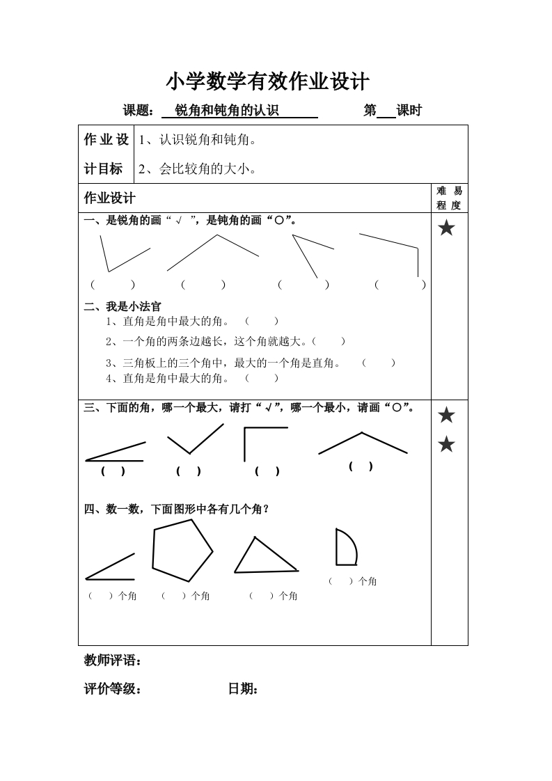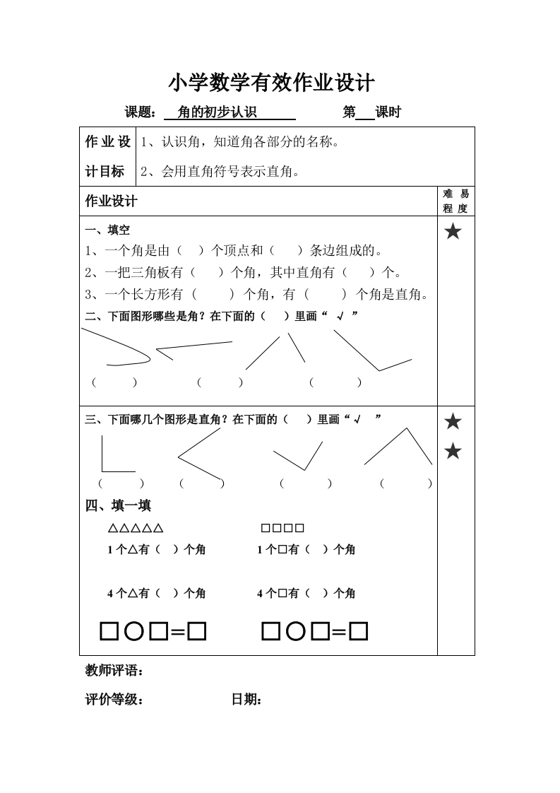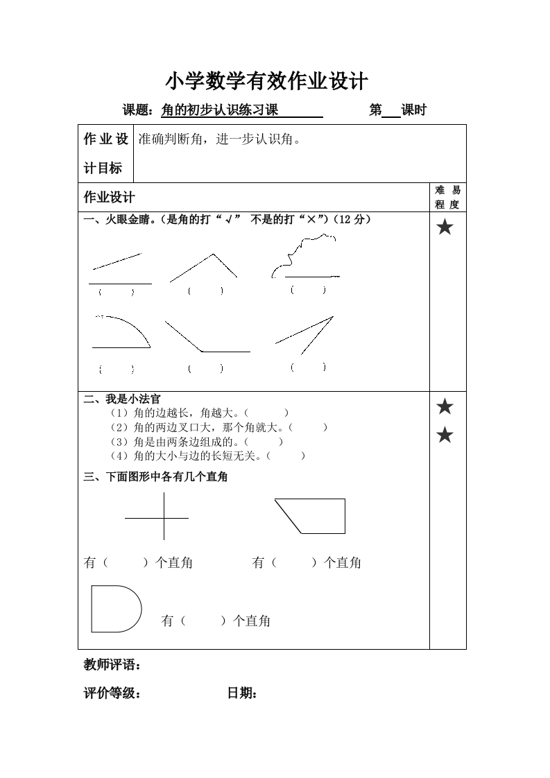 小学数学有效作业设计课题:角的初步认识第课时作业设1、认识角,知道角各部分的名称。计目标2、会用直角符号表示直角。作业设计难易程度一、填空★1、一个角是由()个顶点和()条边组成的。2、一把三角板有()个角,其中直角有()个。3、一个长方形有()个角,有()个角是直角。二、下面图形哪些是角?在下面的()里画“√”三、下面哪几个图形是直角?在下面的()里画“√”★四、填一填△△△△△▣口口▣1个△有()个角1个▣有()个角4个△有()个角4个口有()个角口O口=口口0口=口教师评语:评价等级:日期: