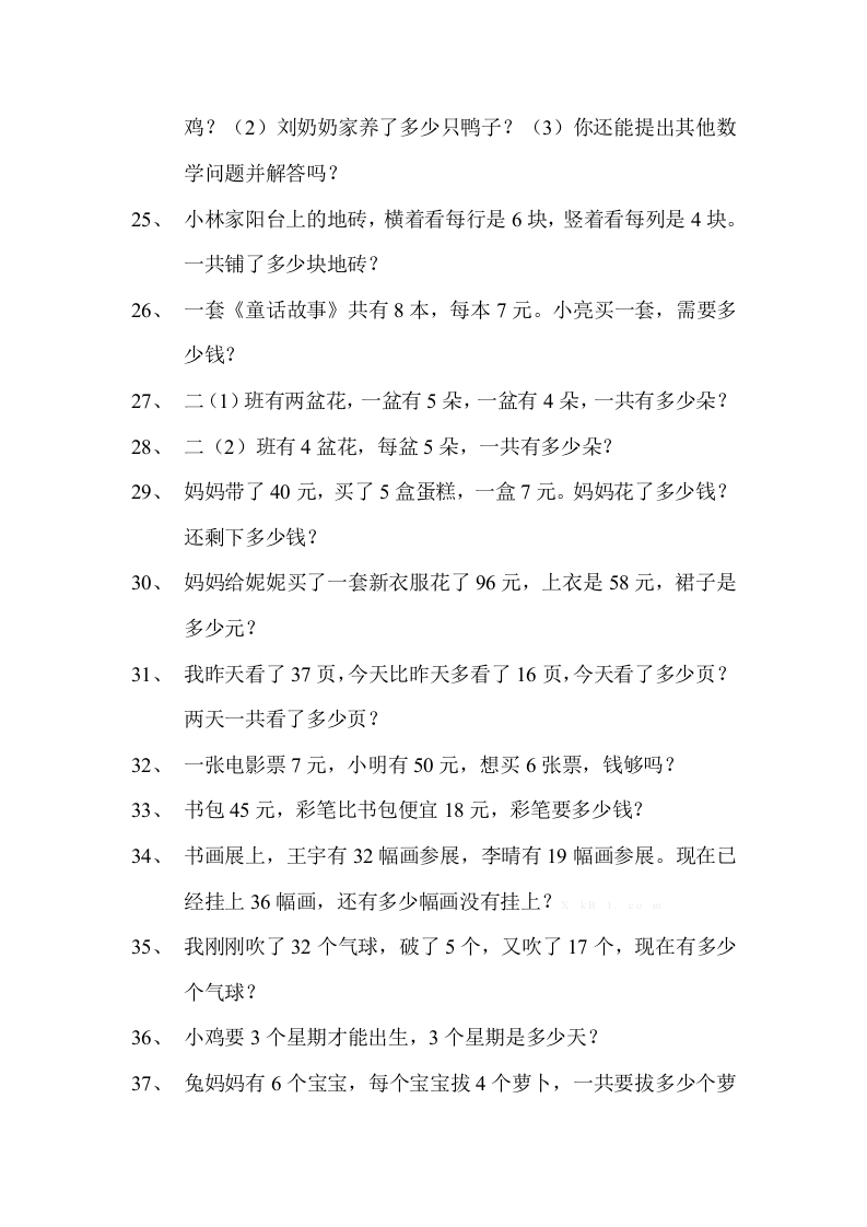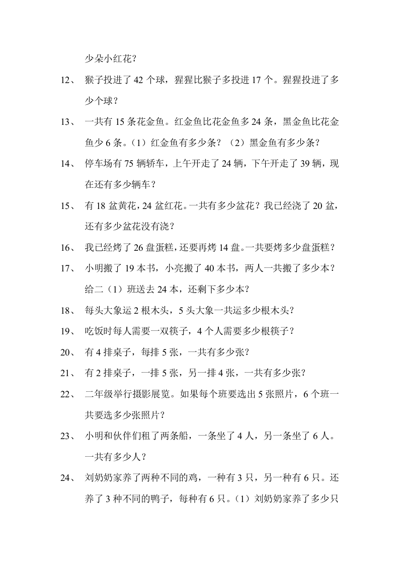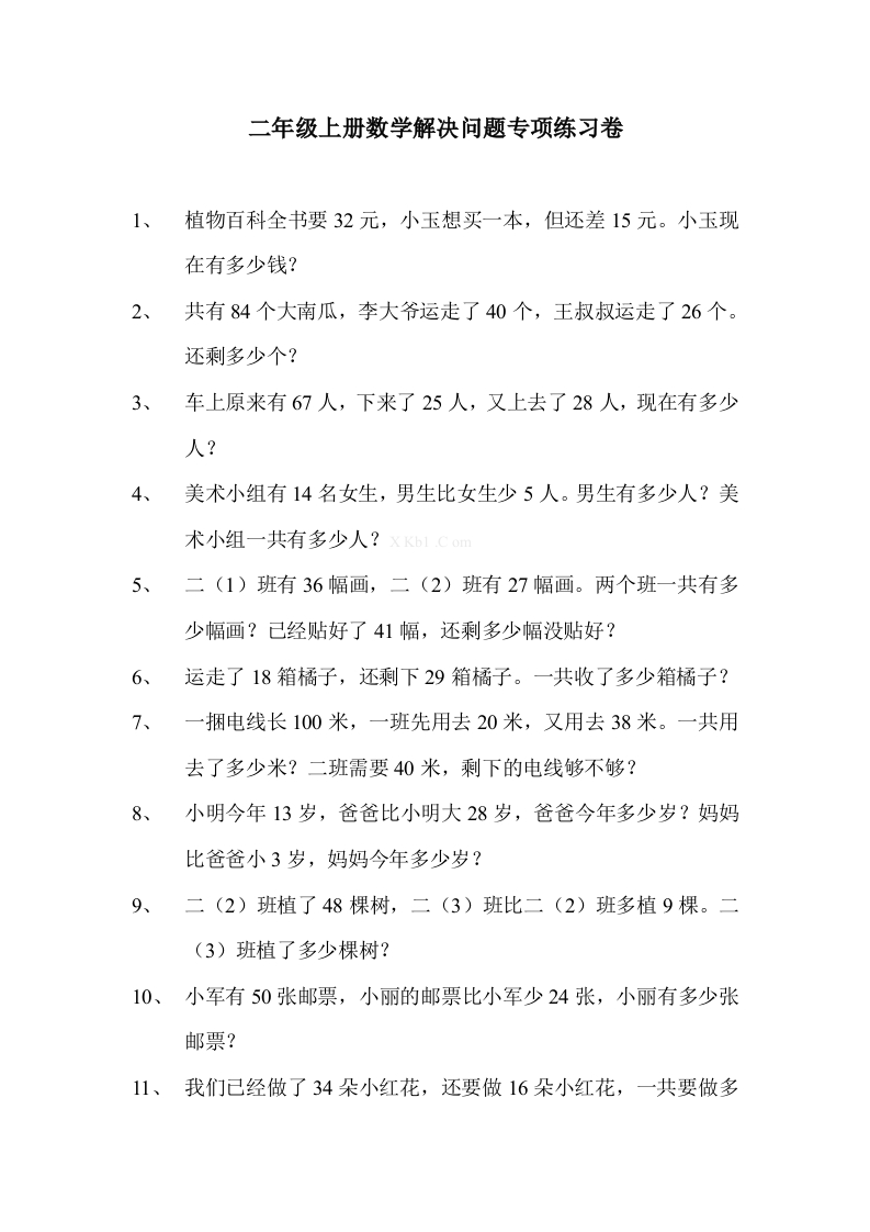 二年级上册数学解决问题专项练习卷1、植物百科全书要32元,小玉想买一本,但还差15元。小玉现在有多少钱?2、共有84个大南瓜,李大爷运走了40个,王叔叔运走了26个。还剩多少个?3、车上原来有67人,下来了25人,又上去了28人,现在有多少人?4、美术小组有14名女生,男生比女生少5人。男生有多少人?美术小组一共有多少人?XK1C5、二(1)班有36幅画,二(2)班有27幅画。两个班一共有多少幅画?己经贴好了41幅,还剩多少幅没贴好?6、运走了18箱橘子,还剩下29箱橘子。一共收了多少箱橘子?7、一捆电线长100米,一班先用去20米,又用去38米。一共用去了多少米?二班需要40米,剩下的电线够不够?8、小明今年13岁,爸爸比小明大28岁,爸爸今年多少岁?妈妈比爸爸小3岁,妈妈今年多少岁?9、二(2)班植了48棵树,二(3)班比二(2)班多植9棵。二(3)班植了多少棵树?10、小军有50张邮票,小丽的邮票比小军少24张,小丽有多少张邮票?11、我们已经做了34朵小红花,还要做16朵小红花,一共要做多