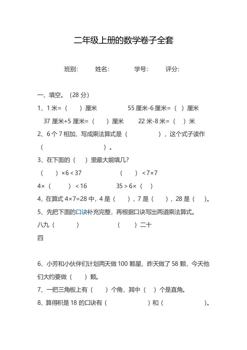 二年级上册的数学卷子全套班别:姓名:学号:评分:一、填空。(28分)1、1米=()厘米55厘米-6厘米=()厘米37厘米+5厘米=()厘米22米-8米=()米2、6个7相加,写成溗法算式是(),这个式子读作)。3、在下面的()里最大能填几?()×6<37()<7×74×()<1635>6×()4、在算式4×7=28中,4是(),7是(),28是()。5、先把下面的口诀补充完整,再根据口诀写出两道乘法算式。八九(()二十四6、小芳和小伙伴们计划两天做100颗星,昨天做了58颗,今天他们大约要做()颗。7、一把三角板上有()个角,其中()个是直角。8、算得积是18的口诀有()和()。