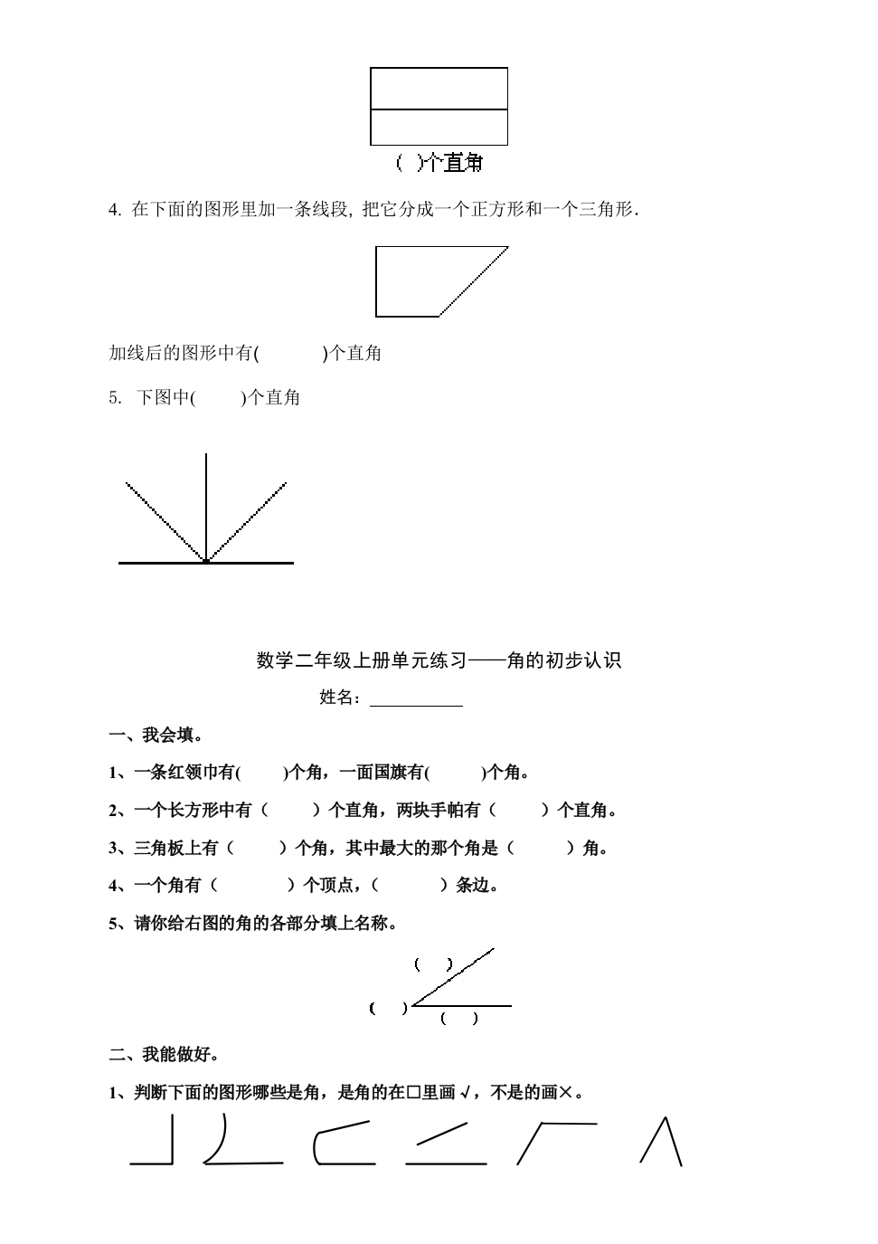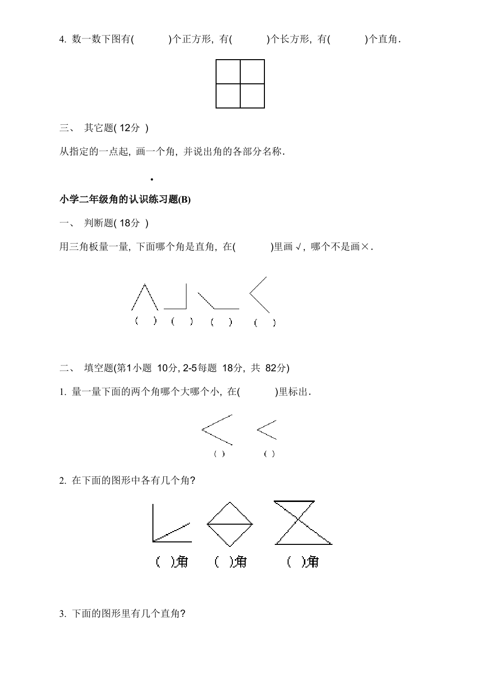 二年级上册语文-角的认识xmtt884个月前发布关注私信66KB5页04010 第1页 / 共5页 第2页 / 共5页 第3页 / 共5页 试读已结束,还剩2页,您可下载完整版后进行离线阅读 二年级上册语文-角的认识此内容为付费资源,请付费后查看¥1¥2会员服务免费立即购买您当前未登录!建议登陆后购买,可保存购买订单付费资源© 版权声明文章版权归作者所有,未经允许请勿转载。THE END数学 文本预览 二年级第一学期数学《角的认识》检测试题(共3套)一、判断题(每道小题12分共24分)1.下面图形,哪些是角?哪些不是角?画出√或×.∠○八()()()2.下面哪几个图形是直角?是的画√,不是画×.二、填空题(1-2每题12分,第3小题16分,第4小题24分,共64分)1.下面图形各有几个角,在()里填几2.下面图形中哪些角是直角?有几个,填在()里3.下面图形中有()直角.有()个直角有()个直角 查看更多 收起部分 喜欢就支持一下吧点赞10 分享QQ空间微博QQ好友海报分享复制链接收藏