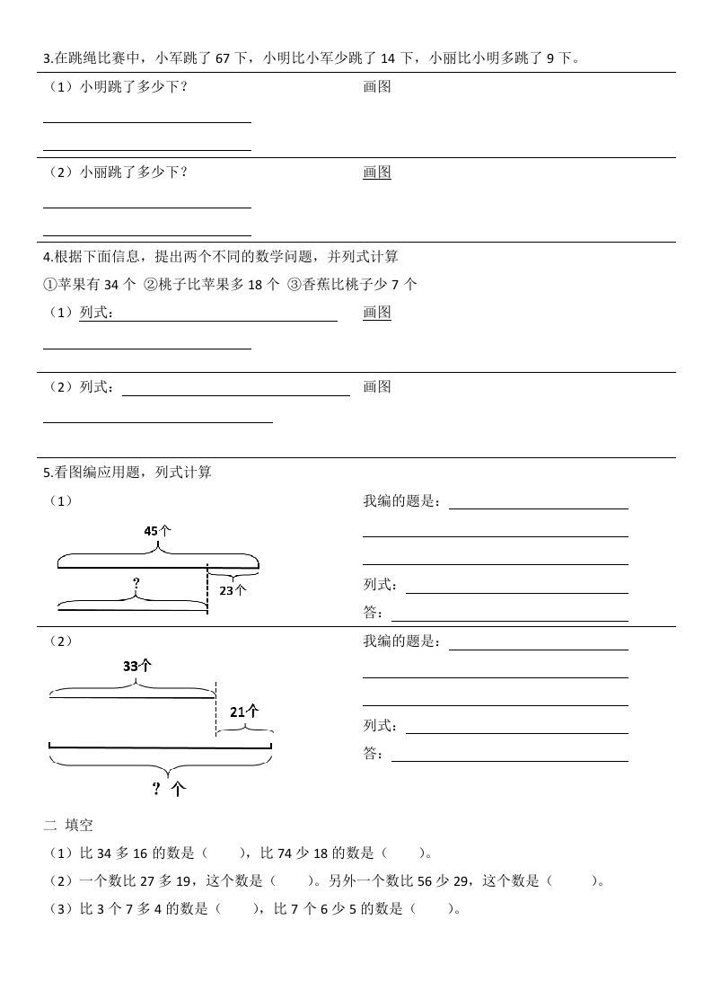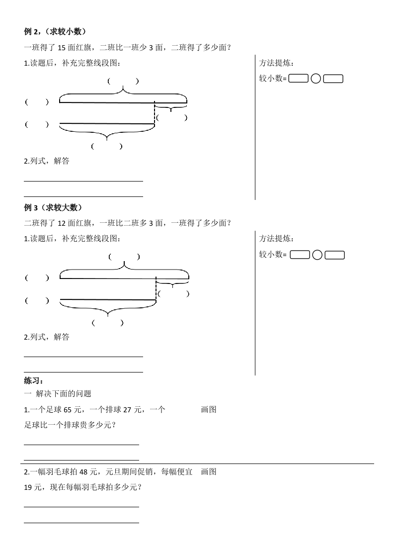 解决问题(比多比少问题)线段图:较大数相差数较小数分析:两个数量用一一对应进行比较时,较大数被分成了两部分,同样多的部分和相差部分。求较大数,相当于把“同样多的部分”和“相差部分”合起来,用加法计算。求较小数,相当于求“同样多的部分”,用减法计算。求相差数,相当于求“相差部分”,用减法计算。方法点拨:先找到关键句,分清谁与谁比,谁多谁少,求什么,再选择正确的方法。例1(求相差数)一班得了15面红旗,二班得了12面,一班比二班多得了多少面?1.读题后,补充完整线段图:方法提炼:相差数=☐○☐2.列式,解答3.你还能提出什么问题并解答吗?