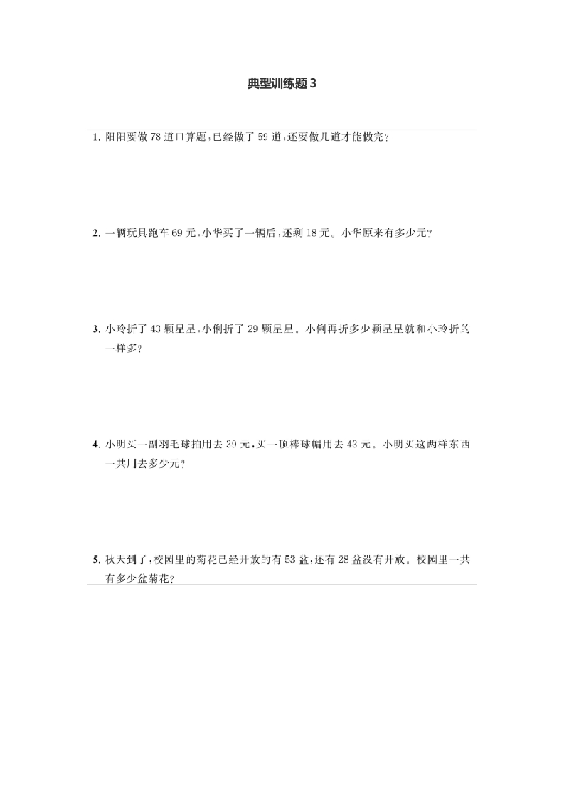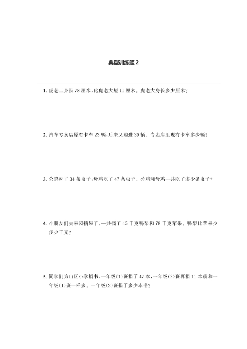 二年级典型训练《100以内的加减法》含答案xmtt884个月前发布关注私信0.45MB8页0288 第1页 / 共8页 第2页 / 共8页 第3页 / 共8页 试读已结束,还剩5页,您可下载完整版后进行离线阅读 二年级典型训练《100以内的加减法》含答案此内容为付费资源,请付费后查看¥1¥2会员服务免费立即购买您当前未登录!建议登陆后购买,可保存购买订单付费资源© 版权声明文章版权归作者所有,未经允许请勿转载。THE END数学 文本预览 典型训练题11.小明吃了24个樱桃,还利36个。原来有樱桃多少个?2.公共汽车上原有39人,又上来15人。车上现有多少人?3.动物园里有鸵鸟23只,企鹅比鸵鸟多45只。企鹅有多少只?4.图书馆里有91本绘画书,一(2)班借走了29本。图书馆里还剩多少本绘画书?5.爸爸妈妈吃了47颗葡萄,明明和弟弟比爸爸妈妈少吃19颗。明明和弟弟吃了多少颗? 查看更多 收起部分 喜欢就支持一下吧点赞8 分享QQ空间微博QQ好友海报分享复制链接收藏