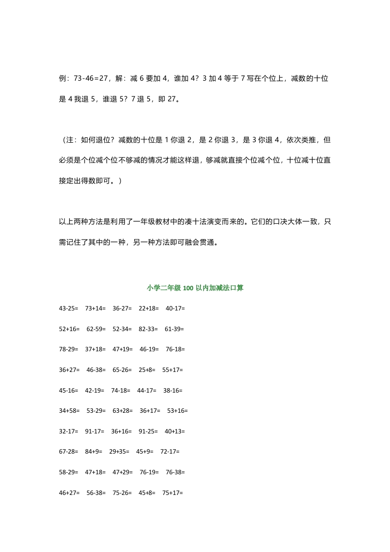 方法1.两位数加两位数的进位加法口诀:加9要减1,加8要减2,加7要减3,加6要减4,加5要减5,加4要减6,加3要减7,加2要减8,加1要减9。(注:口决中的加几都是说个位上的数)例:26+38=64解:加8要减2,谁减2?26上的6减2.38里十位上的3要进4。(注:后一个两位数上的十位怎么进位,是1我进2,是2我进3,是3我进4,依次类推。那朝什么地方进位呢,进在第二个两位数上十位上。如本次是3我进4,就是这两个两位数里的2+4=6。)这里的26+38=64就是6-2=4写在个位上,是3进4加2就等于6写在十位上。再如42+29=71。就用加9要减1这句口决,2-1=1,把1写在个位上,是2我进3,4+3=7,把7写在十位上即得71。两位数加两位数不进位的加法,就直接写得数就行,如25+34=59,个位加个位写在等号后的个位上5+4=9,十位加十位写在十位上即可2+3=5,即59。不必列竖式计算。本办法学会了百试百灵,比计算器还快。方法2.两位数减两位数的退位减法口决:减9要加1,减8要加2,减7要加3,减6要加4,减5要加5,减4要加6,减3要加7,减2要加8,减1要加9。(注:口决中的减几都是说减个位上的数)。