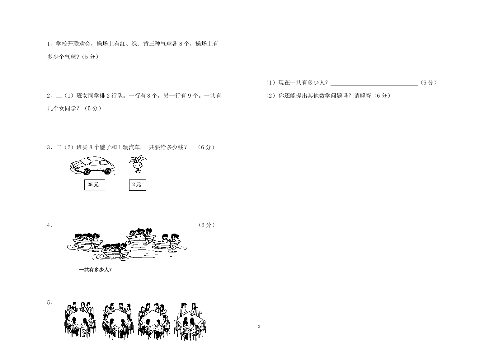 二年级数学上册第六单元试卷时间:40分钟满分:100分班姓名成绩三、看图列式(12分)一、口算。(12分)1、一共有多少个O?8×6=7×4=6+5=9×4=6×9+9=OOOOOOOO09×2=8×57×1=2×6=7+7+7+7=0O0000OO0二、填一填。(30分)(第4小题4分,其余各题每空1分。)00000O1、按要求补充算式。(6分)7×()=429×()=63()×5=358×()=483×()=27()×6=302、在O里填上“>”“<”或“=”。(4分)8×5O8+56×6○4×97×7○147×1○7+1有几人?3、看谁填得对。(6分)七()五十六三()二十四()九十八四、他们分别拿到了什么礼物,请连线(12分)五()三十五八()六十四六()五十四4、7×8=(),可以表示求()个()连加的和是()。(4分)计算7×8和8×7时,都可以用这句口诀来求积。5、3的9倍是(),8的6倍是()。(2分)6、()里面最大能填几?(4分)7×()<3845>8×()3×()<2552>9×()7、请你写4个积是24的乘法算式.(4分)五、解决问题。(34分)
