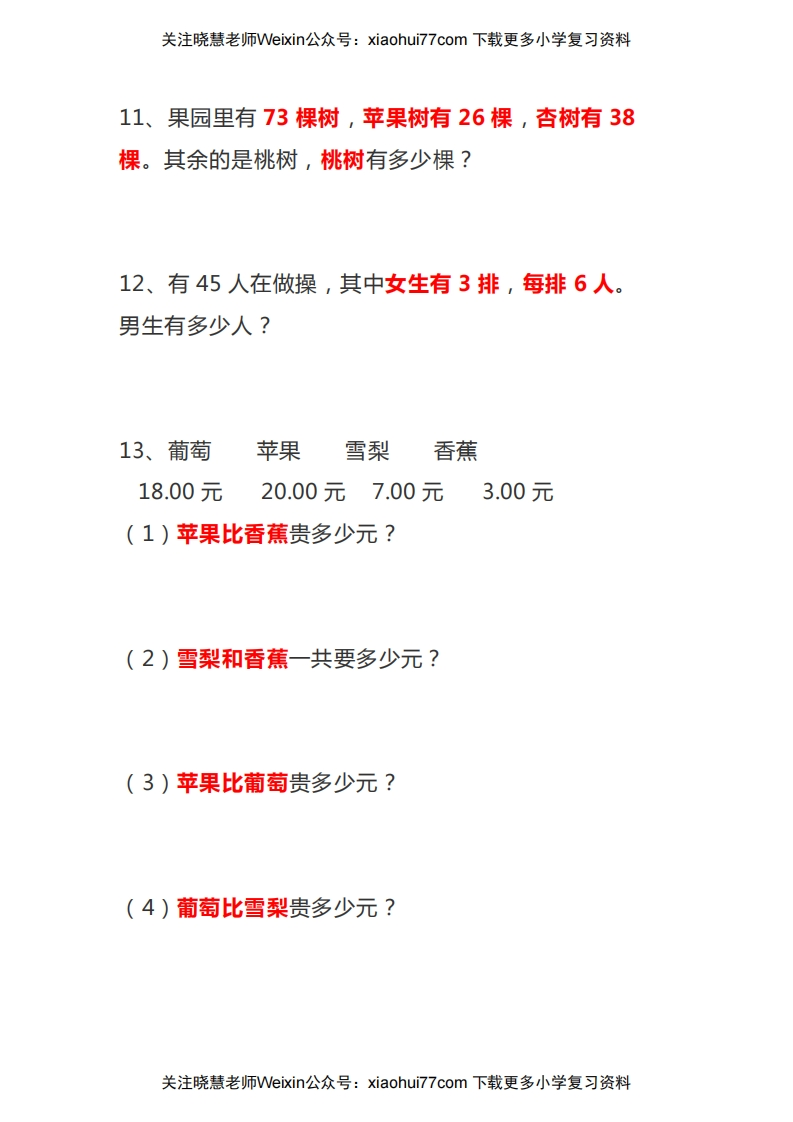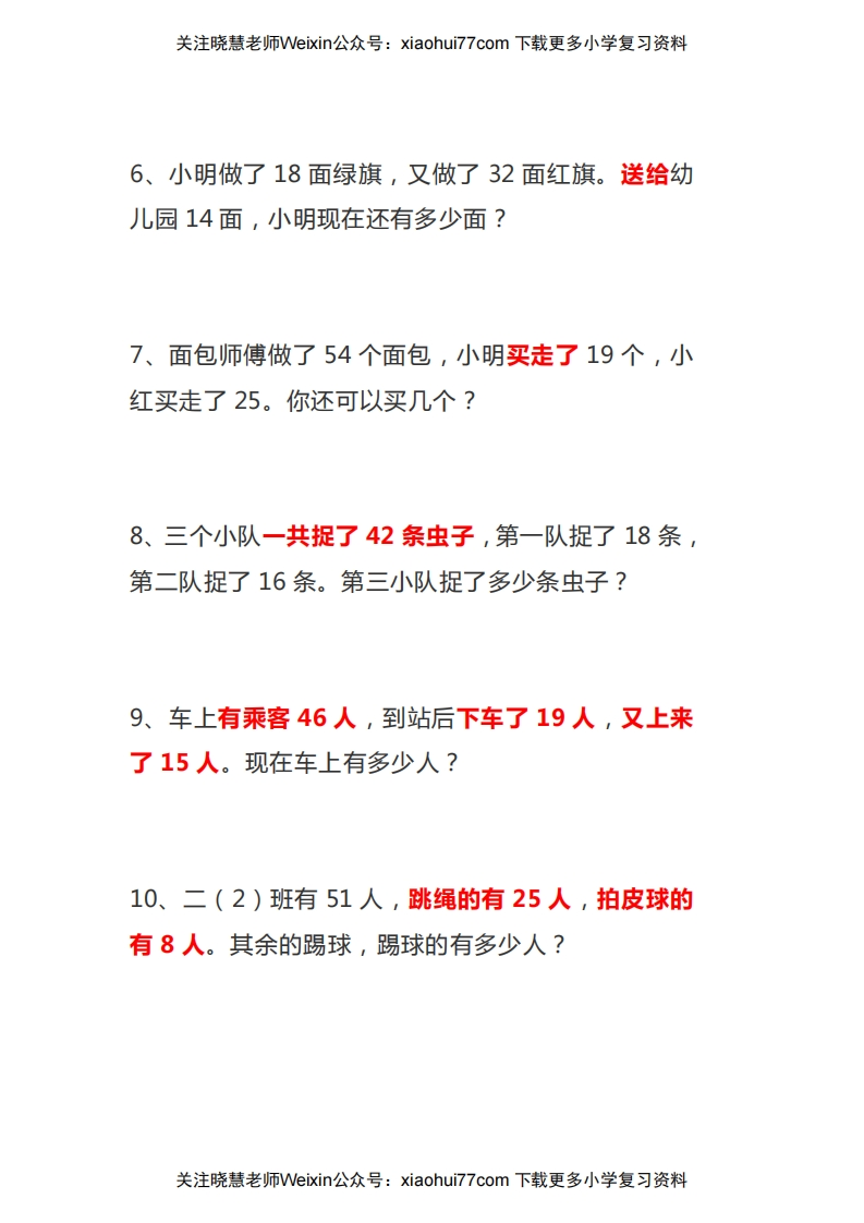 关注晓慧老师Veixin公众号:xiaohui77com下载更多小学复习资料二年级数学上册期未综合应用题1、三个小组一共修理椅子52把,第一组修理了20把,第二组修理了18把。第三组修理了多少把?2、一双拖鞋8元,一双袜子4元。小明拿了20元钱买一双拖鞋和一双袜子,应找回多少元?3、图书馆有故事书96本,第一周借出28本,第二周借出30本,现在还有多少本书?4、花丛中有蜻蜓和蝴蝶共35只,飞走了6只,又飞来了12只。现在花丛中蜻蜓和蝴蝶有多少只?5、停车场有卡车35辆,有轿车24辆。开走了17辆,现在有多少辆车?关注晓慧老师Veixin公众号:xiaohui77com下载更多小学复习资料