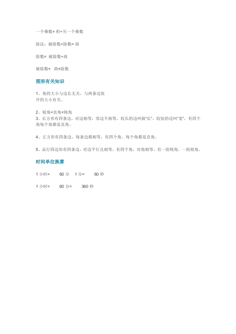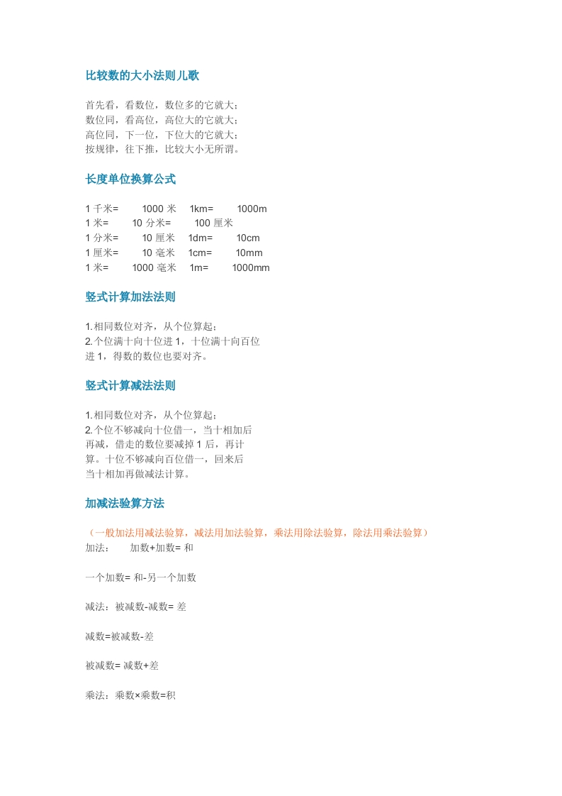 二年级数学公式、法则、儿歌、口诀除法的竖式计算口诀和法则1、除号写端正,数位要对齐,被除数里面藏,除数对面站,商在上面看。2、用乘法口诀试商,又快又准确:3、有余数除法口诀一试:除数和几相乘的积最接近被除数,又比被除数小,上就是几。二乘:商和除数的积写在被除数下面。三减:被除数减去商和除数的积。四比:余数和除数比,余数要比除数小。有余数的除法运用规律运用有余数除法的有关知识解决问题时,有图的要先看图,明确题意,再找出相关信息进行计算,最后根据余数确定最终答案。生活中的方向歌早晨起来,面向太阳,前面是东,后面是西,左面是北,右面是南。地图中的方向歌画图要面北,上北、下南、左西、右东。读数写数要牢记读数要大写,写数要小写,读数写数都从最高位起。写数时要注意,哪位有几就写几,没有数时有“0”记:读书时,要牢记,末尾零,都舍去,中间无论几个零,读出一个就可以。