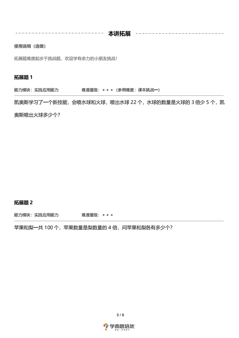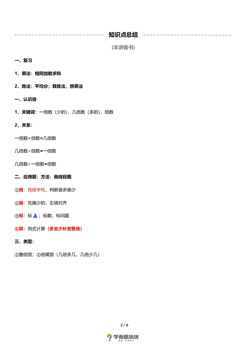 二年级寒假数学第1讲能量补给站本讲简介能力模块:实践应用能力课程目标:1、认识"”倍”,熟悉”倍”的三要素,以及学会解决三要素中知二求一的问题;2、学会画线毅图,加深对”倍”的理解:3、用”倍”的相关知识,解决实际生活中的问题。课程重点:理解倍数的含义;根据“倍”的含义解决相关问题;学习用线段图表示倍数关系。课程难点:用除法求一倍数;解决倍尾型的问题。课程易错点:用除法求一倍数以及倍尾型的问题。校内衔接:人教版一一二下:表内除法苏教版一一二下:有余数的除法北师大版一一二下:分一分与除法;三上:乘与除前铺后续:二暑一一表内除法三秋一一和倍问题1/6?学而思培优