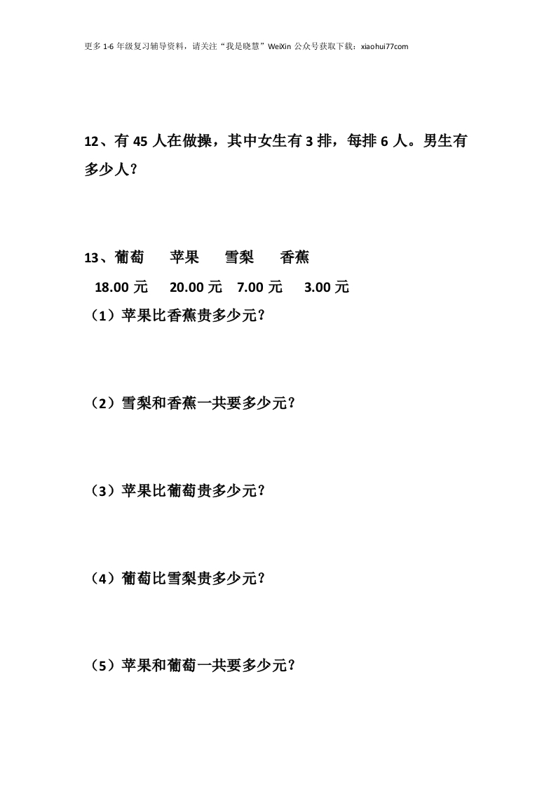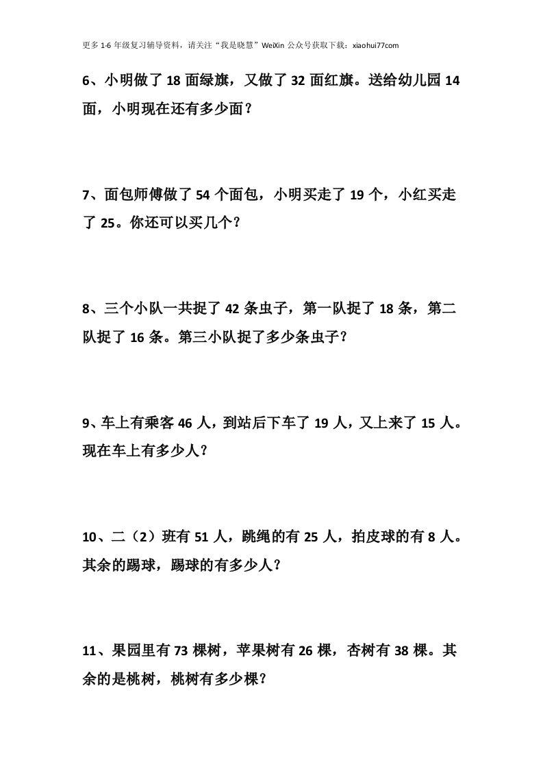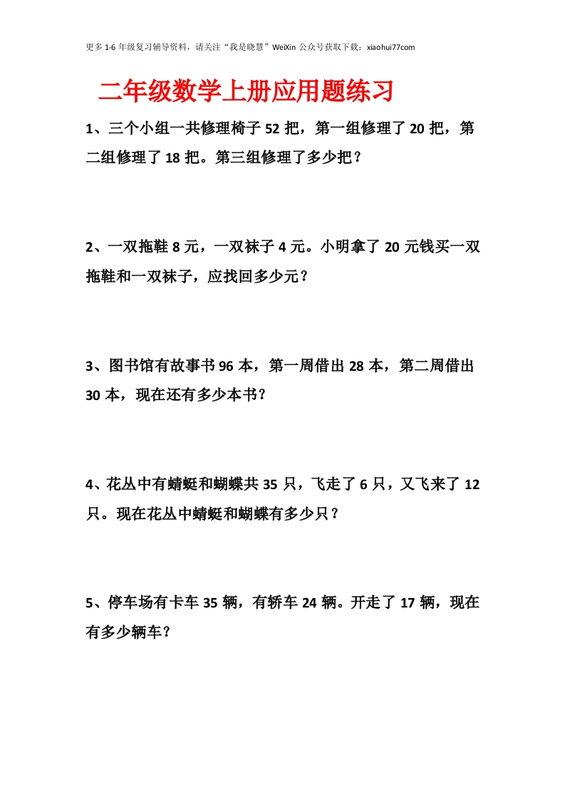 更多16年级复习辅导资料,请关注“我是晓慧”Wein公众号获取下载:xiaohui7?7com二年级数学上册应用题练习1、三个小组一共修理椅子52把,第一组修理了20把,第二组修理了18把。第三组修理了多少把?2、一双拖鞋8元,一双袜子4元。小明拿了20元钱买一双拖鞋和一双袜子,应找回多少元?3、图书馆有故事书96本,第一周借出28本,第二周借出30本,现在还有多少本书?4、花丛中有蜻蜓和蝴蝶共35只,飞走了6只,又飞来了12只。现在花丛中蜻蜓和蝴蝶有多少只?5、停车场有卡车35辆,有轿车24辆。开走了17辆,现在有多少辆车?