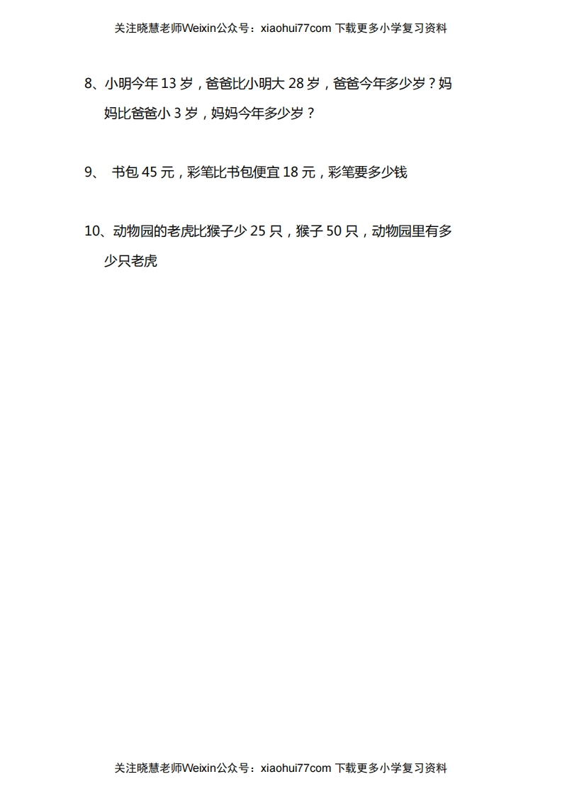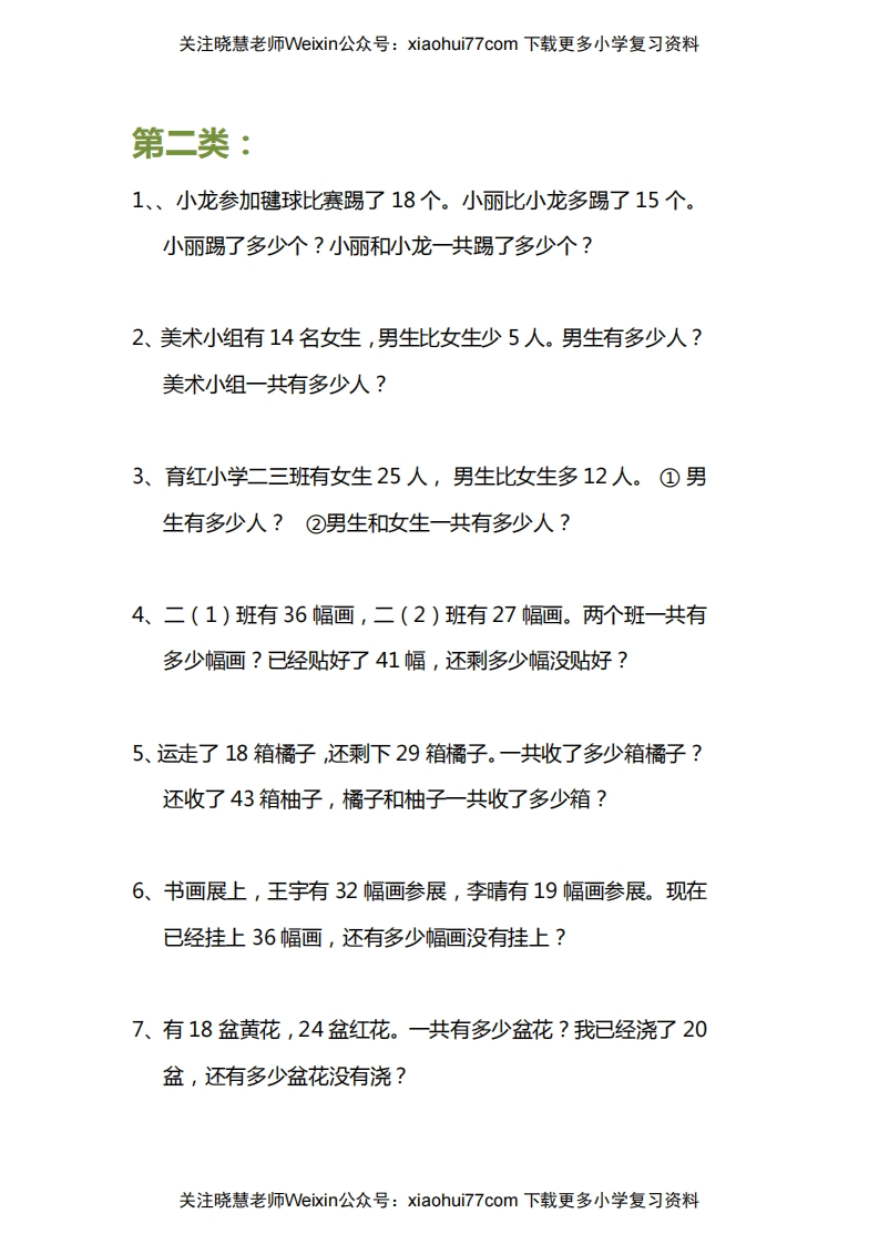 关注晓慧老师Veixin公众号:xiaohui77com下载更多小学复习资料二年级上册数学解决问题专项练习第一类:1、大乌龟下了86个蛋,小乌龟比大乌龟少下了9个蛋,小乌龟下了多少个蛋?2、人工野鸭岛今年有53只野鸭,去年比今年少18只。去年有多少只?3、猴子投进了42个球,猩猩比猴子多投进17个。猩猩投进了多少个球?4、我已经读了35页,妹妹比我读的少8页。妹妹读了多少页?5、一共有15条花金鱼。红金鱼比花金鱼多24条,黑金鱼比花金鱼少6条。(1)红金鱼有多少条?(2)黑金鱼有多少条?6、二(2)班植了48棵树,二(3)班比二(2)班多植9棵。二(3)班植了多少棵树?7、小军有50张邮票,小丽的邮票比小军少24张,小丽有多少张邮票?关注晓慧老师Veixin公众号:xiaohui777com下载更多小学复习资料