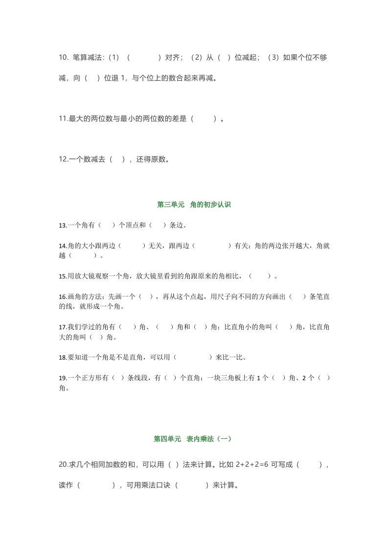 第一单元长度单位1.()是测量长度的工具。2量比较短的物体,可以用()作单位;量比较长的物体,通常用()作单位。3.“厘米”可以用()表示,“米”可以用()表示。4.1米=()厘米,1米-30厘米=(),40cm+60cm=()5.70厘米7米50m50cm2米200厘米6.线段是()的,有()个端点;连接两点只能画()条线段。7.从尺的刻度0开始画起,画到刻度()的地方就是3厘米;从尺的3cm开始画起,画到10cm的地方,就是()。8.数学书长26(),一棵大树高6(),小明高1()32()。第二单元100以内的加法和减法(二)9.笔算加法:(1)()对齐;(2)从()位加起;(3)如果个位相加满十,向()位进1。