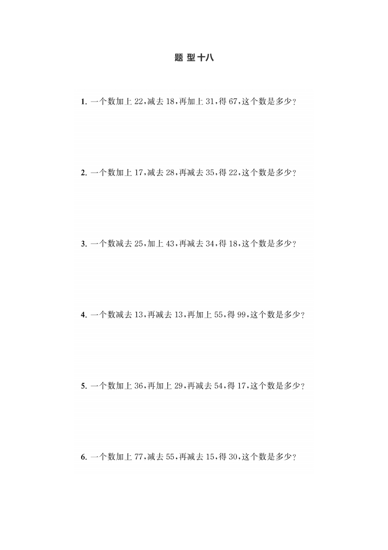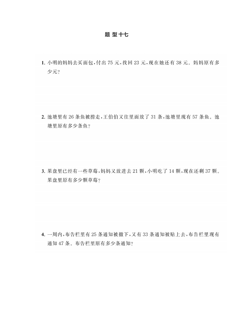 题型十六1.小冠和小亚各做了37朵花,布置教室用了45朵,剩下的全部送给小季。小季拿到了多少朵花?2.商场进了一批冰箱,第一周卖掉17台,第二周卖掉34台,这时还剩下44台。商场进了多少台冰箱?3.同学们参加农业社会实践,男生摘了29筐黄瓜,比女生摘的茄子多12筐。男、女生共摘了多少筐蔬菜?4.北极熊妈妈捕了许多鱼,她给小白27条,给小灰34条。小白和小灰共吃了16条。小白和小灰现在还有几条鱼?5.阳阳家离小卖部36米。有一天他去买东西,走了18米发现没带钱,马上回去拿。这天他去小卖部一共要走多少米?
