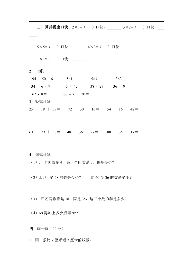 小学数学二年级上册期中考试试卷填空。1.4×3=()读做(),写成加法算式是(),表示()。其中4和3都叫()。2.6个3相加的和,列式(3.比48少19的数是(),48比19多(4.一个数,十位数字比8大,个位数字比1小,这个数是()。5.在()里填上正确的数。47+()=8034-()=2960-()=3312+()=1253-()=5313+()=156.在O里填上>、<或=。54-8O455×5O30-543+15O51+4380-25○63×4○4×34×4O20-54×2O4+427+8O27-87.在O里填上十、-或×。504=1208503=154○4=161O5=548○36=4○38.在括号里填上合适的数。()×3=123×5=()+7()×2=8()×5=1550-38=()×()二、选择正确答案的序号填在括号里。1、选择“米、厘米”填在括号里:(6分)旗杆高8()床长20()字典厚4(杯高10()钉子长2()2.()接近1米。A、篮球运动员身高B、教室长C、足球场的宽D、讲台高3.5×3+5=5×()A、3B、1C、4D、5三、计算。