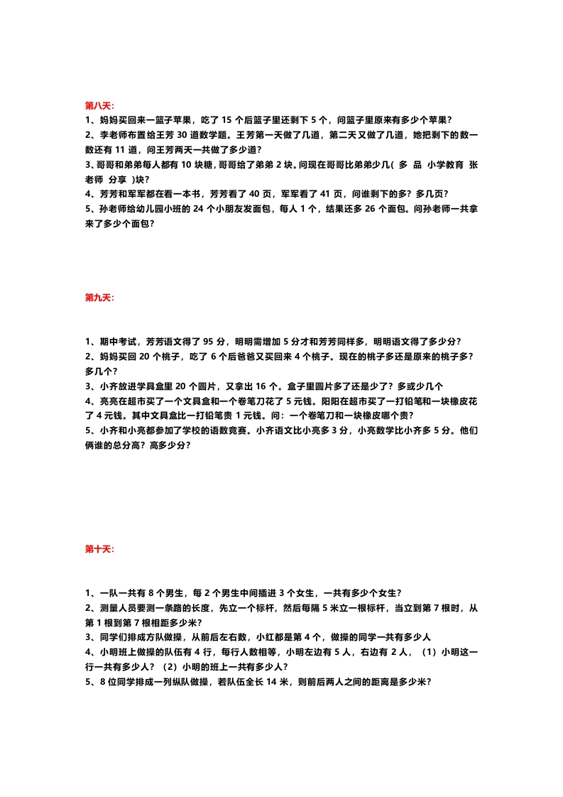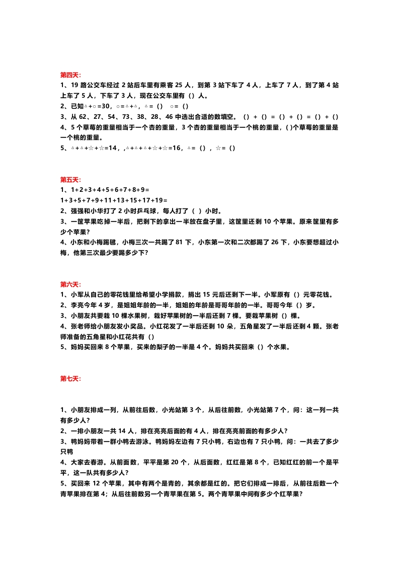 小学数学二年级:思维拓展训练13套第一天:1、将3、4、5、6分别填入括号中,使等式成立()+()·()=()2、将10、12、14、16分别填入括号中,使等式成立()+()·()=()3、将3、4、6、8、10、11这6个数分别填入括号里(每个数只能用一次),使两个等式成立。()+()=()()·()=()4、将15、25、35、45、55、65分别填入括号里,使等式成立,每个数只用一次。()+()=()+()=()+()5、把2、4、6、8、10、12、14、16这8个数分别填入下面的()里,使等式成立,每个数只用一次。()+()·()=(),()+()·()=()第二天:1、有12个小朋友一起玩“猫捉老鼠”的游戏,已经捉住了7人,还要捉()人。2、敦室里的10盏日光灯都亮着,现在关掉2盏日光灯,教室里还剩()盏日光灯。3、长方形有四个角,剪掉一个角,还剩几个角,你能想到()中情况。4、0+△=26,△,+△+0=30,8=(),0=();5、猎人去打猎,他的家离目的地有8干米,他离家走出3干米时,发现没有带猎枪,又回家去取。猎人最后到达目的地走得路程有多少干米?第三天:1、0+0+0=15,0+△+△=19,求△一0=()2、一座5层高的塔,最上边一层装了2只灯,往下每低一层多装4只灯,最下面一层要装多少只灯?3、两个书架上共80本书,从第一个书架章8本书放入第二个书架,两个书架的本数相等,原来第一个书架有()本书。4、△+△+△=12,△+0=10,△=(),0=()5、找规律填数:4、8、12、16、20、()、()3、1、6、2、12、3、()、()