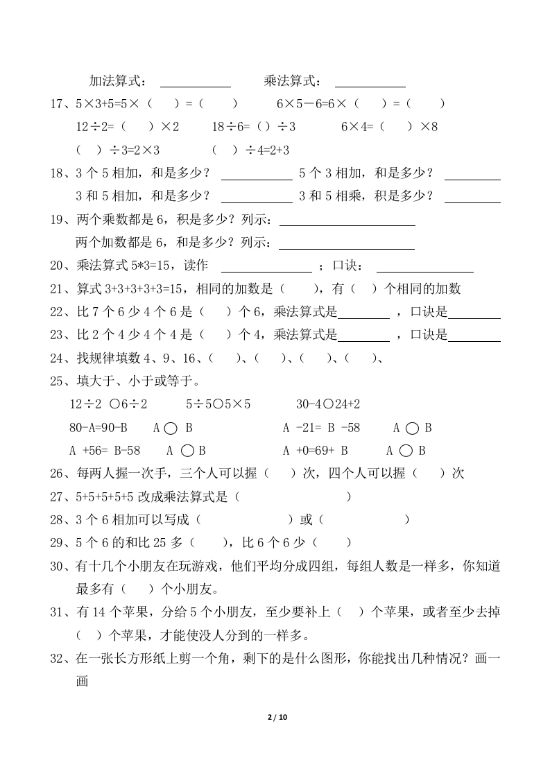 一、填空题1、2和8相加的和是(),2个8相加的和是(),2和8相乘的积是(),2个8相乘的积是()。2、3和5相加的和是(),3个5相加的和是(3和5相乘的积是(),5个3相乘的积是()。3、2和7相加的和是(),2个7相加的和是(2和7相乘的积是(),2个7相乘的积是()。4、3和5相加,和是():3个5相乘,积是()。5、63比我多19,我是():我比58少32,我是():63比我少19,我是():我比58多32,我是()6、4×3=12的口诀是(),6×5的口诀是(4×4的口诀是();3×7的口诀是(7、有两个数,他们的积是12,和是7,这两个数分别是多少?()()8、平行四边形有()条边,它的两组对边()9、4×6+6=(),6+3×6=(),6×8-6×2=()10、一步跳5格,2步跳()格,5步跳()格?5步呢?()11、最大的两位数和最小的两位数的差是()12、7+7+7+7+3可以写成()×()+(),还可以写成()×()-(),13、3和5相加,和是(),3个5相加,和是(14、一个乘数是6,另一个乘数是4,积是(),两个乘数都是5,积是(015、下面()最大能填几?()×6<3525>()×85×()<3328>()×7()×7<30()×3<114×()<2625>()×7()+35<80()-18<37()+26<5585>()+3716、○○○0O0O0OO()个()1/10
