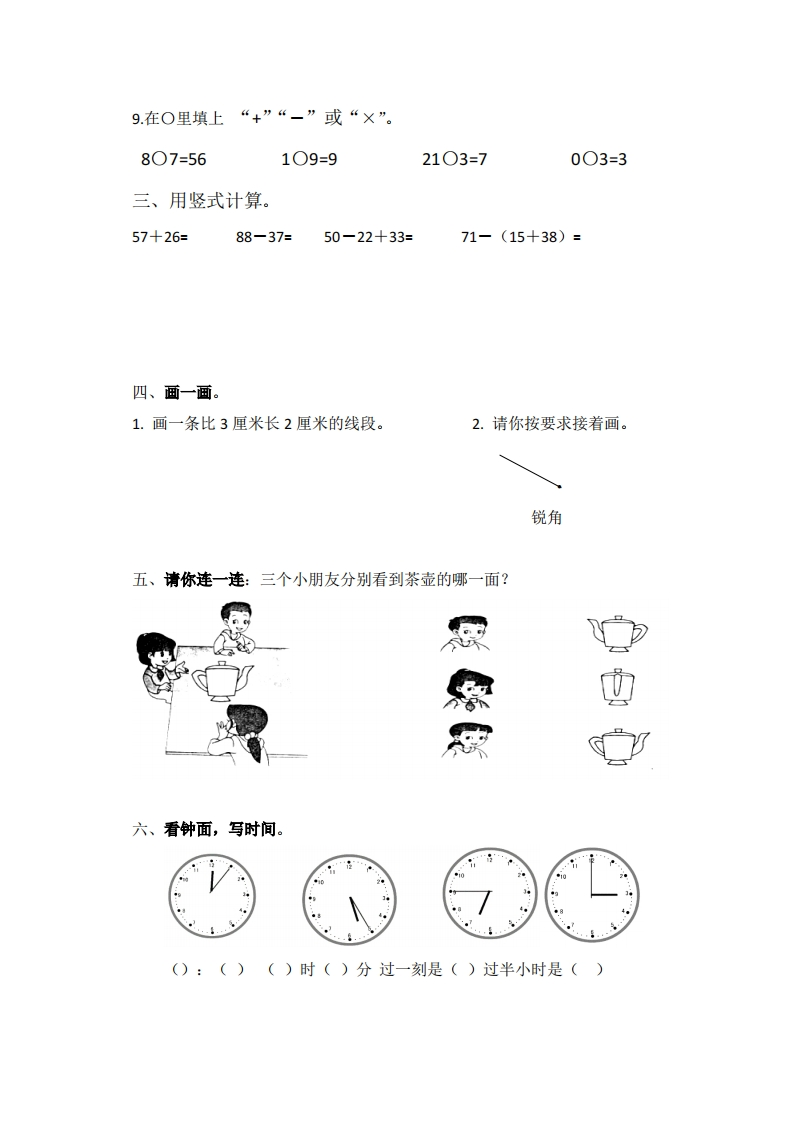 小学数学二年级上册期末综合素养检测卷一、直接写出得数。7X8=8X2=9X8=23+47=6X5-4=6X4=5X7=2+2=37+9=30+7-9=3X5=4×8=5×4=86-10=37+40-9=2X9=6X9=3X3=44-6=8+(53-7)=二、填一填。1.先数一数,再填一填。D,用加法算式用乘法算式表示为:或2.圈出正确答案:小明的身高约132(米厘米)。3.从2、5、9这三个数中,任选其中2个求积,得数有()种可能。4.1米一60厘米=()厘米7厘米+93厘米=()米5.比43多27的数是(),4个9相加的和是()。6.一个角有()个顶点和()条边。圆有()条对称轴。7.分针从3走到7,走了()分钟。8在O里填上“>”“<”或“=”44○28+102×2○2+256-8O6×8一刻○30分