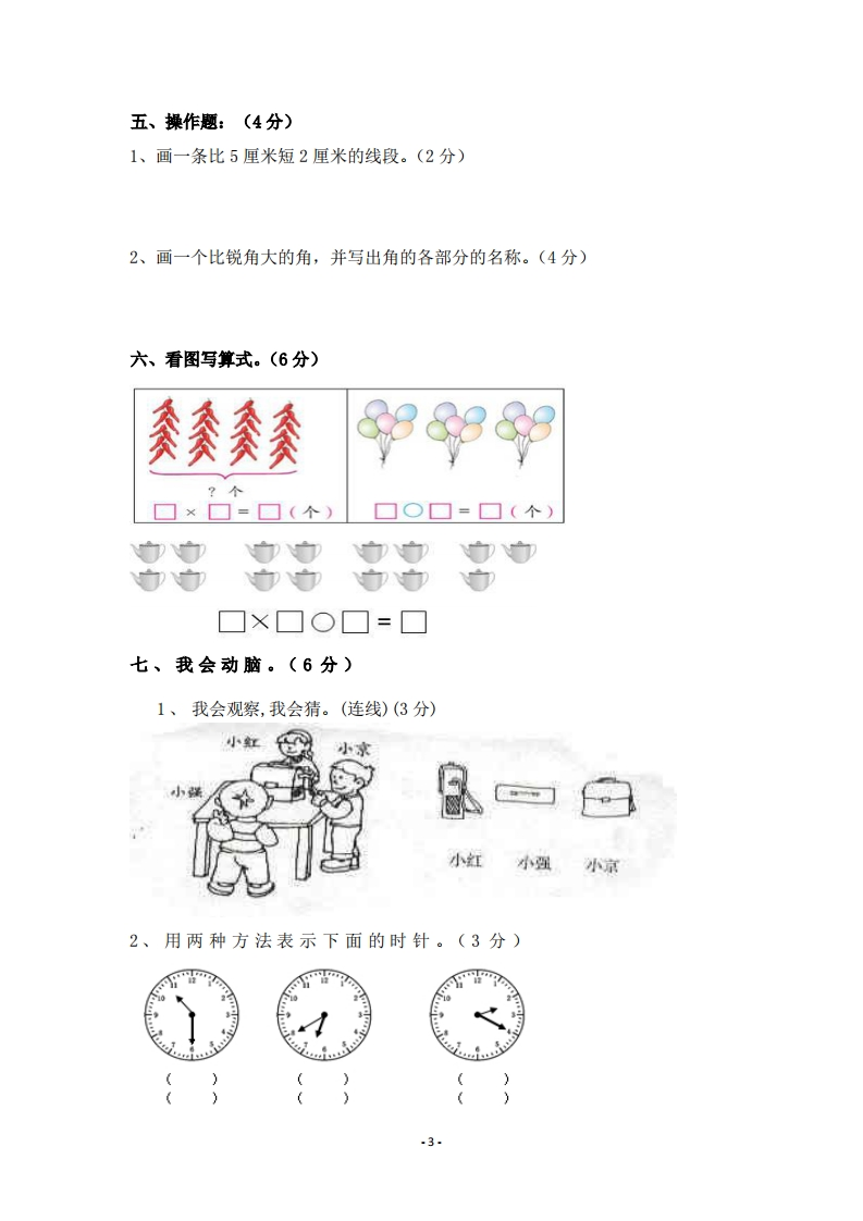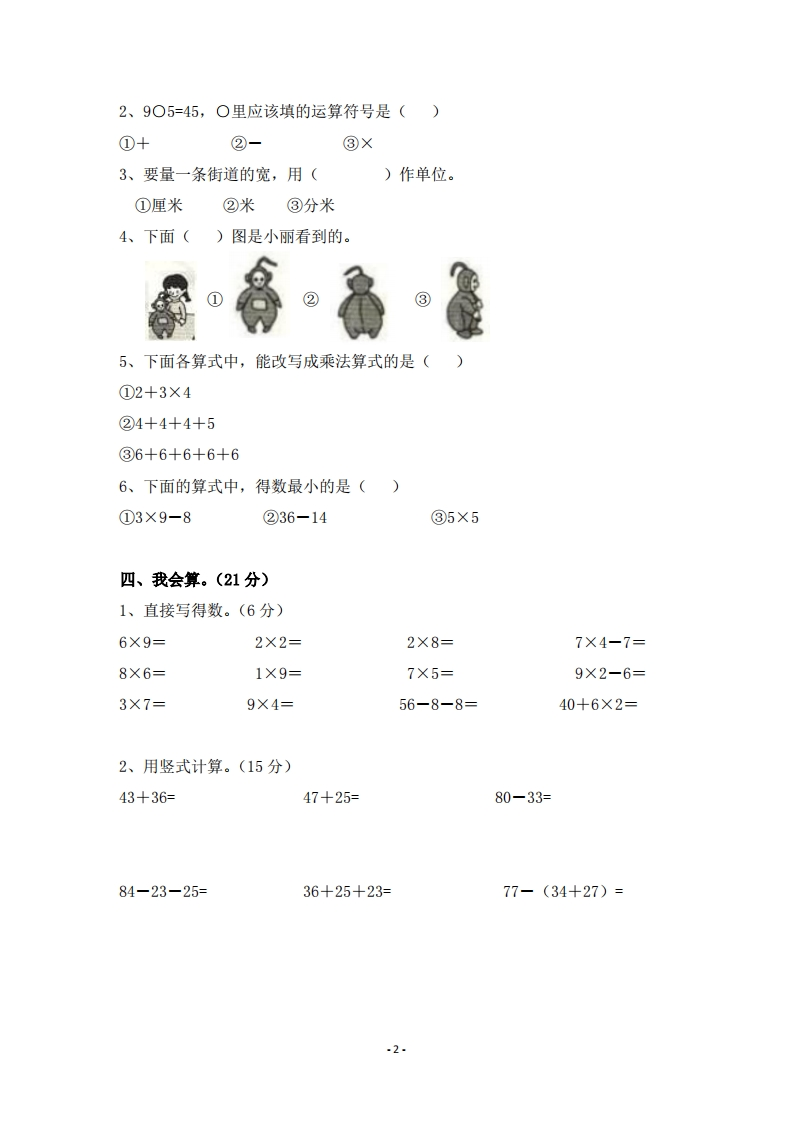 2020学年第一学期二年级数学期末卷(本卷供二年级人教版数学上册第1-8单元使用本卷卷面分3分)一、我会填。(每空1分,共18分)1、5×4=(),读作(2、8个9相加的和是()。3、25与45的和是(),61比21多()。4、根据口诀写出两个乘法算式。三九二十七(四六二十四())5、括号里最大能填几?)×8<5740>6×(6、这个图形中有()个角,其中()个是直角。7、用4、3、7可以摆成()个不同的两位数。8、把下列各数量从小到大排列6米60厘米6米60厘米6厘米)〈()〈()〈(9、填上合适的单位黑板长4(小明身高120()操场跑道400()手指宽约1()文具盒长18()教室门高约2()二、我能辨对错。(6分)1、一张课桌的高约70米。2、1米和100厘米一样长。3、所有的直角都相等。4、两个9相乘的积是18。5、5×8+5=5×9(6、钟表上显示9:30时,时针和分针成一个直角。(三、我会选。(把正确答案的序号填在括号里)(14分)1、3+3+3+2可以写成(①3x3②3x4③3x3+2-1